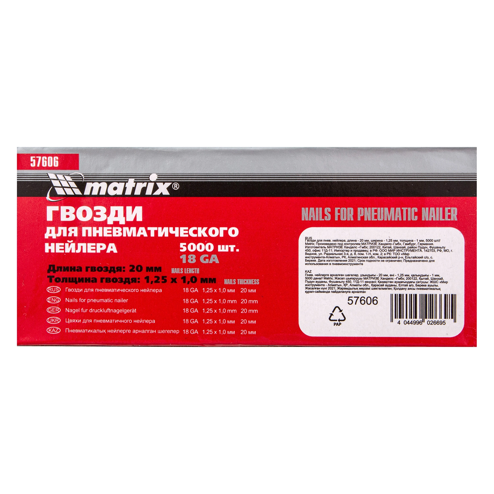 ПроизводителиГвозди для пнев. нейлера, длина - 20 мм, ширина - 1,25 мм, толщина - 1 мм, 5000 шт (57606) MATRIX