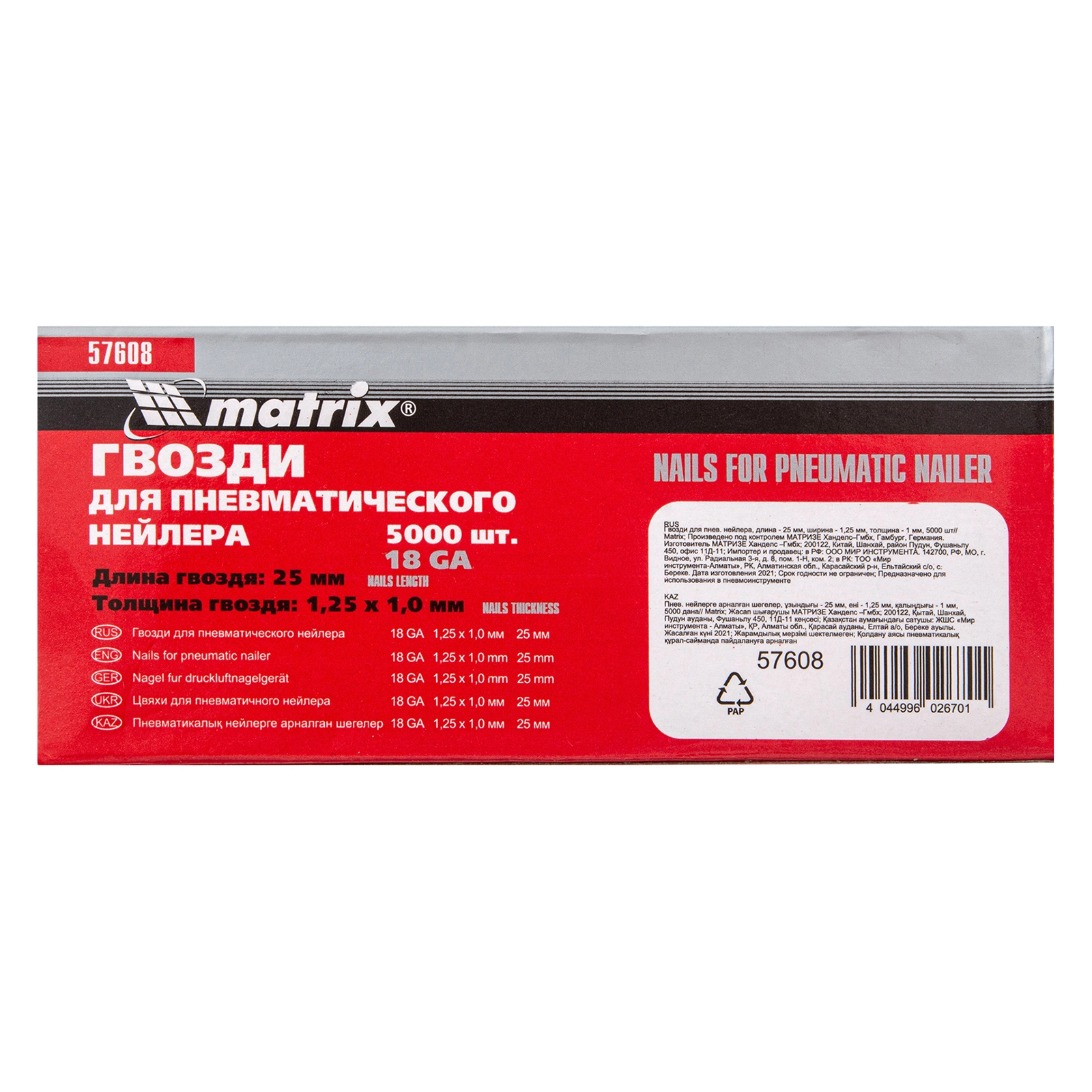 ПроизводителиГвозди для пнев. нейлера, длина - 25 мм, ширина - 1,25 мм, толщина - 1 мм, 5000 шт (57608) MATRIX