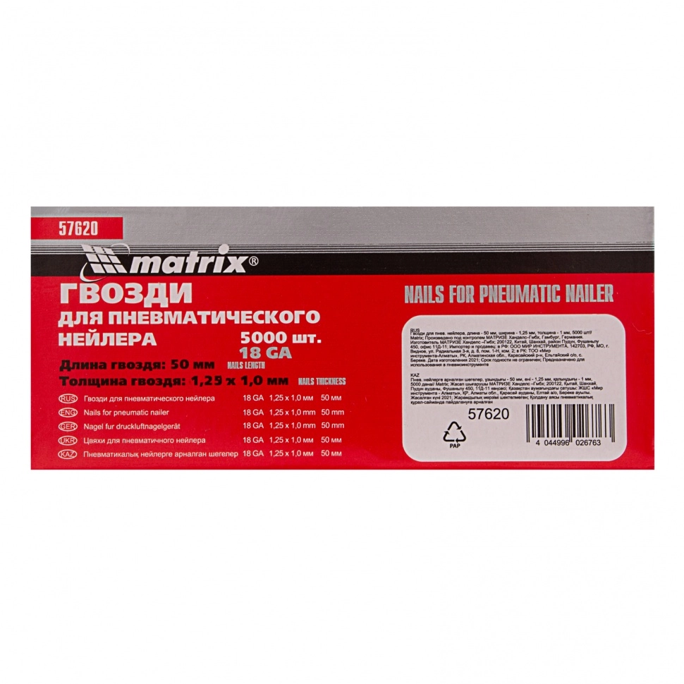 ПроизводителиГвозди для пнев. нейлера, длина - 50 мм, ширина - 1,25 мм, толщина - 1 мм, 5000 шт (57620) MATRIX