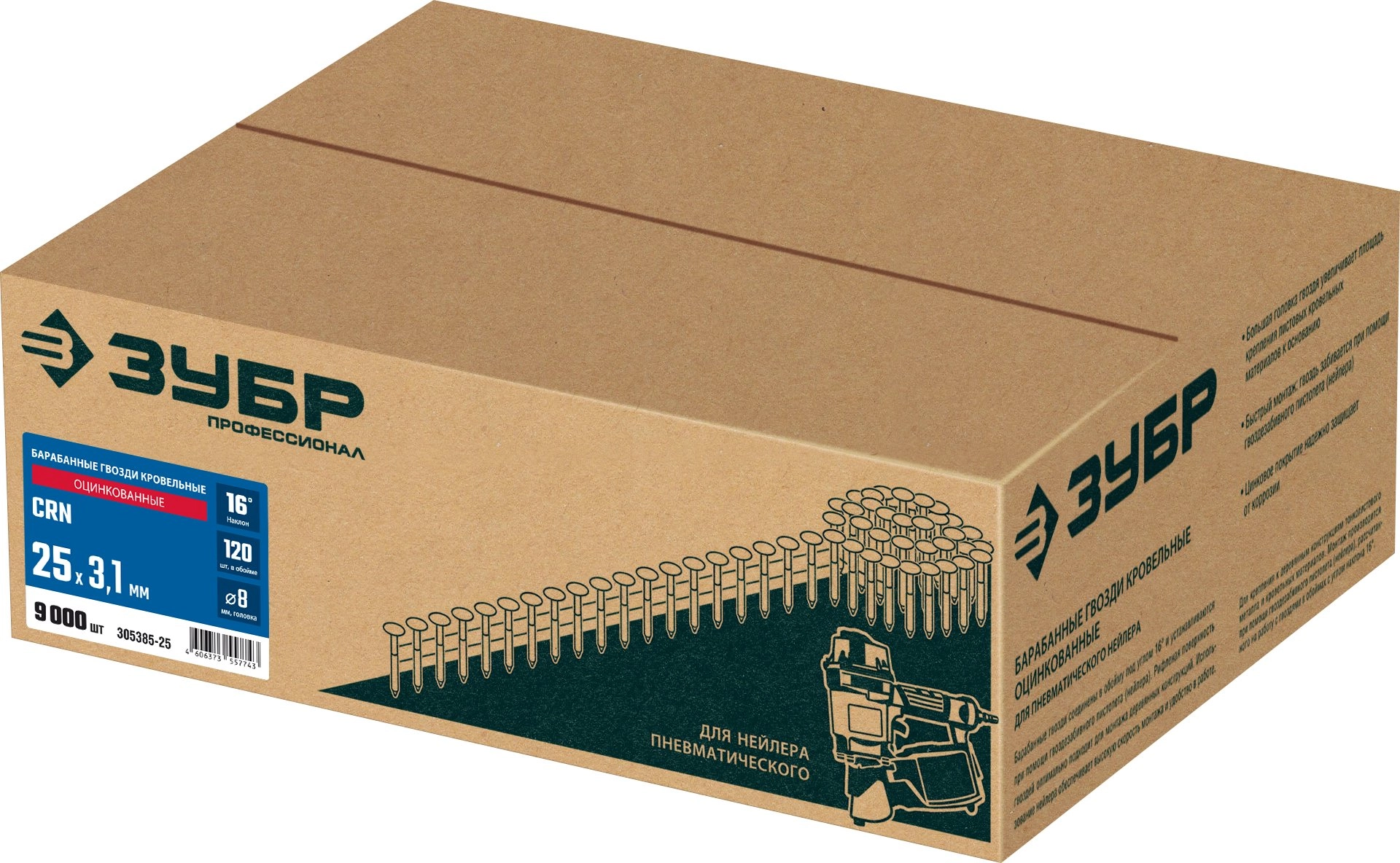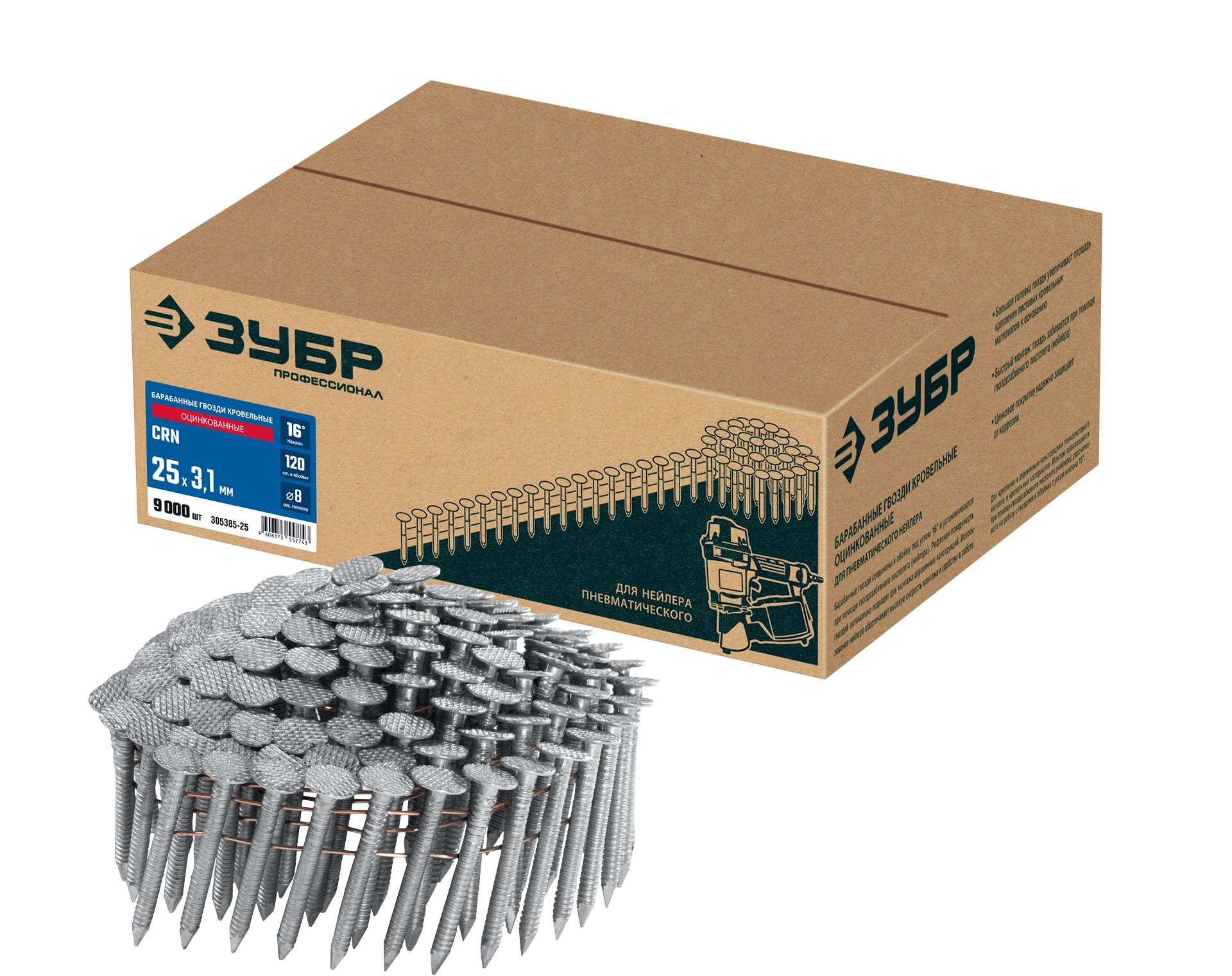 ПроизводителиГвозди кровельные барабанные оцинкованные CRN 25 х 3.1 мм, 9000 шт. (305385-25) ЗУБР