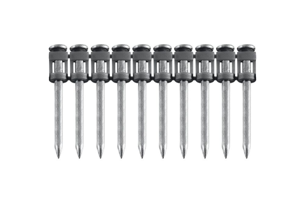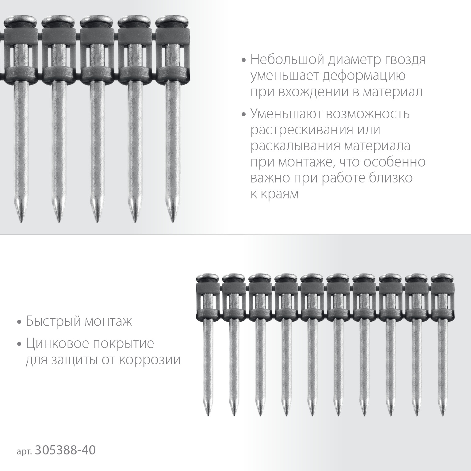 Гвозди по бетону соединены в кассету и забиваются при помощи газового или пневматического гвоздезабивного пистолета (нейлера). Необходимый размер гвоздя подбирается в зависимости от монтируемых материалов.