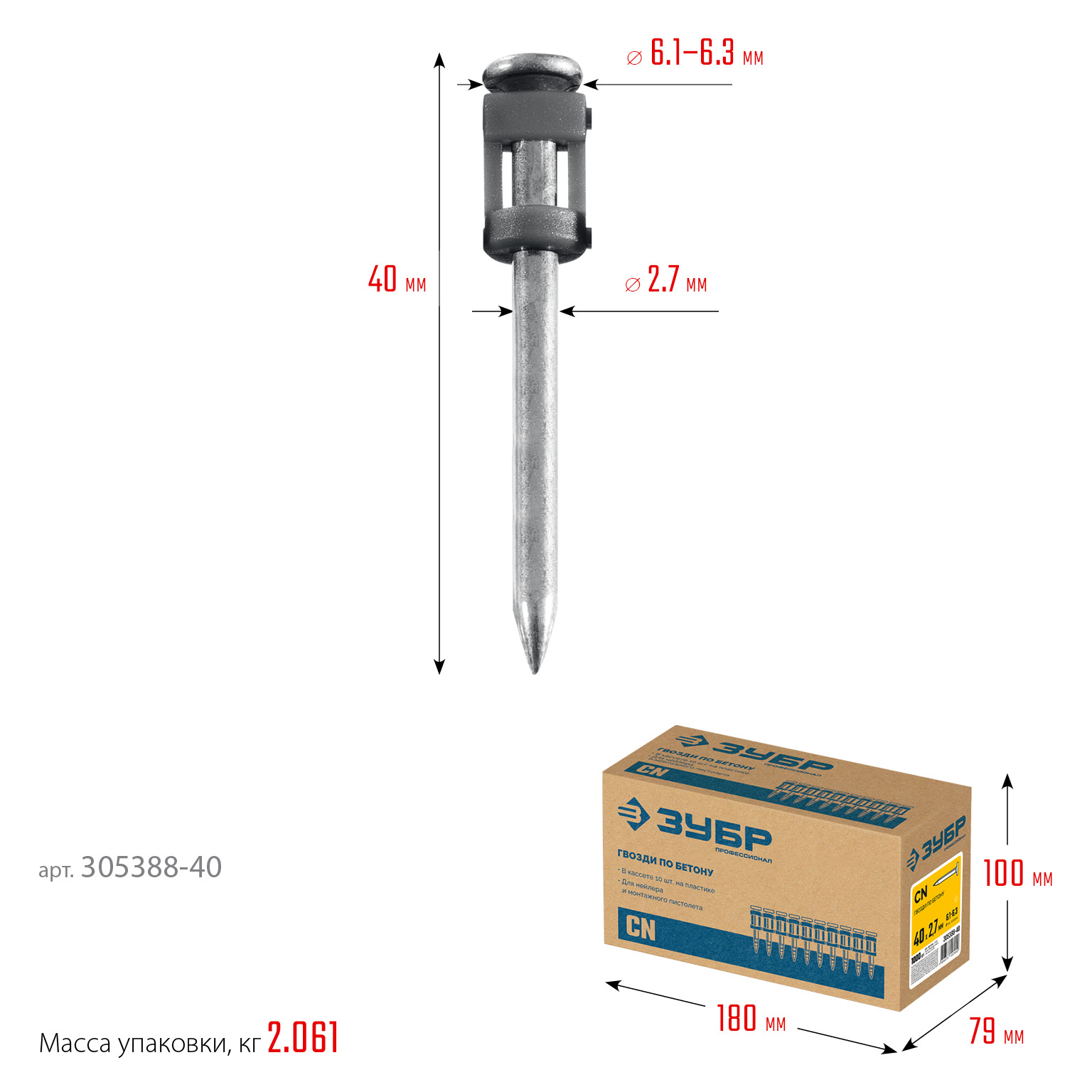 ПроизводителиГвозди монтажные по бетону оцинкованные CN 40х2.7мм, 1000 шт (305388-40) ЗУБР