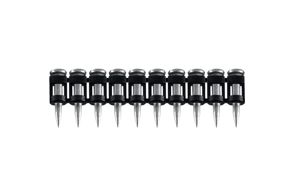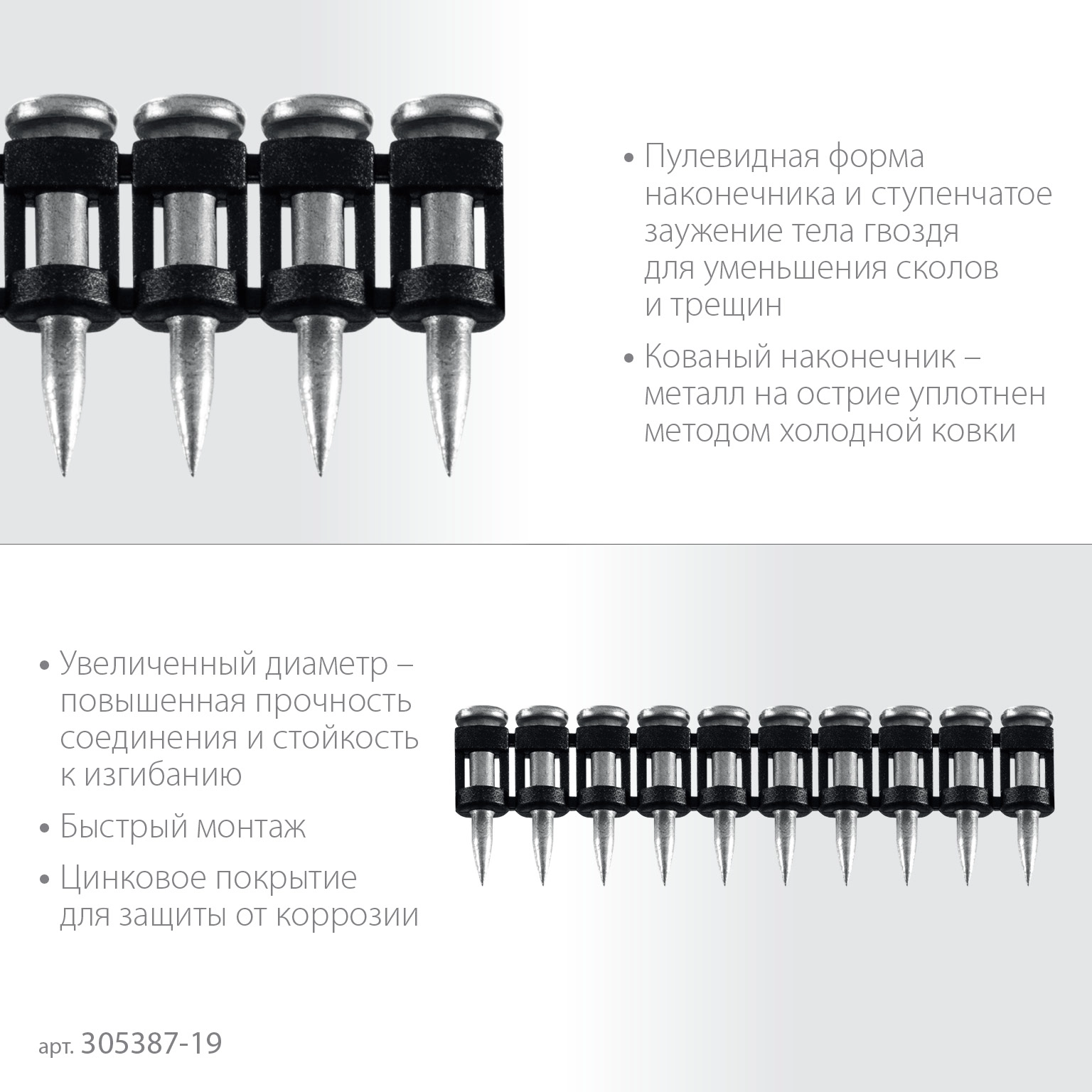 Усиленные гвозди по бетону соединены в кассету и забиваются при помощи газового или пневматического гвоздезабивного пистолета (нейлера). Кованый наконечник пулевидной формы облегчает вхождение в высокопрочные материалы.