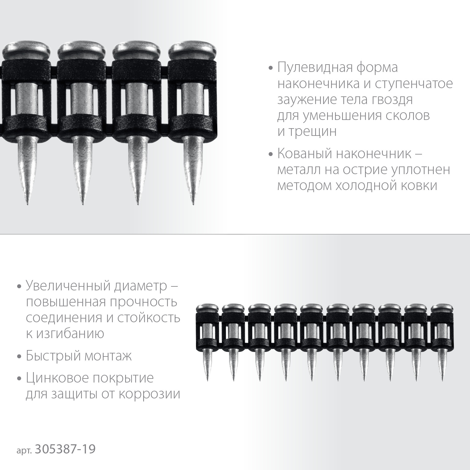 Пулевидная формы наконечника и ступенчатое заужение тела гвоздя до 2,7 мм повышают качество работ за счет уменьшения сколов и трещин.