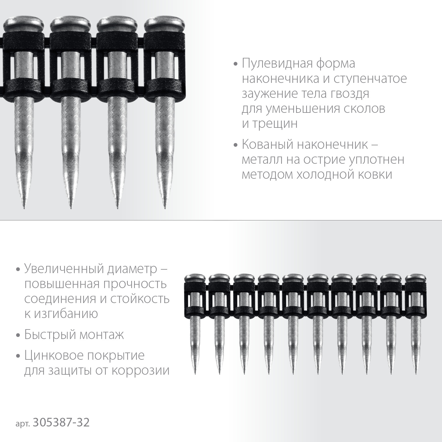 Металл на острие гвоздя уплотняется в процессе производства методом холодной ковки, что обеспечивает увеличенную скорость и легкость монтажа. Это особенно важно при попадании гвоздя в твердые фракции в неоднородных материалах.