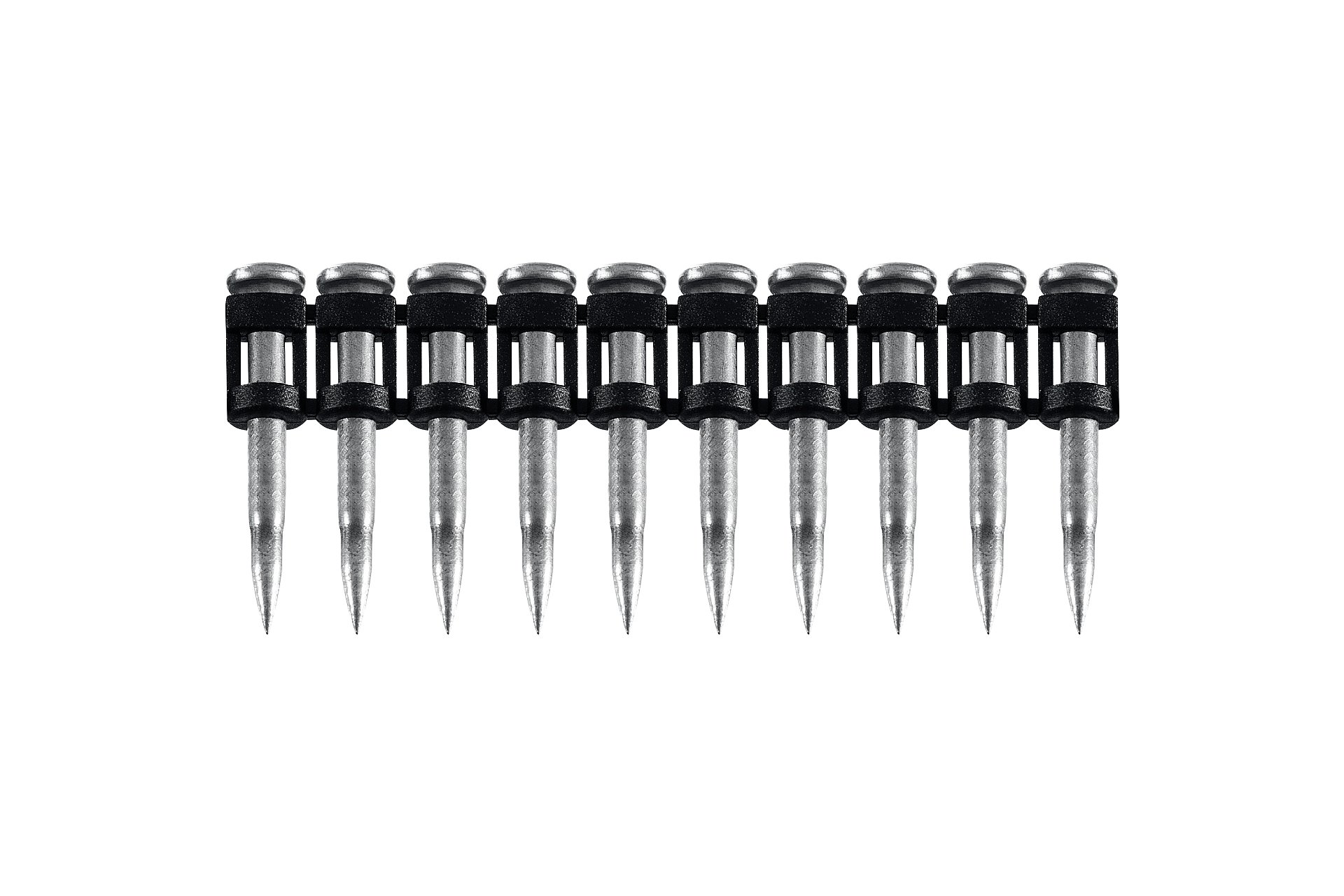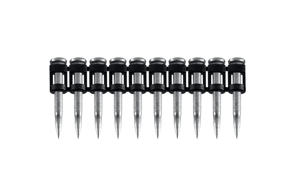 Усиленные гвозди по бетону соединены в кассету и забиваются при помощи газового или пневматического гвоздезабивного пистолета (нейлера). Кованый наконечник пулевидной формы облегчает вхождение в высокопрочные материалы.