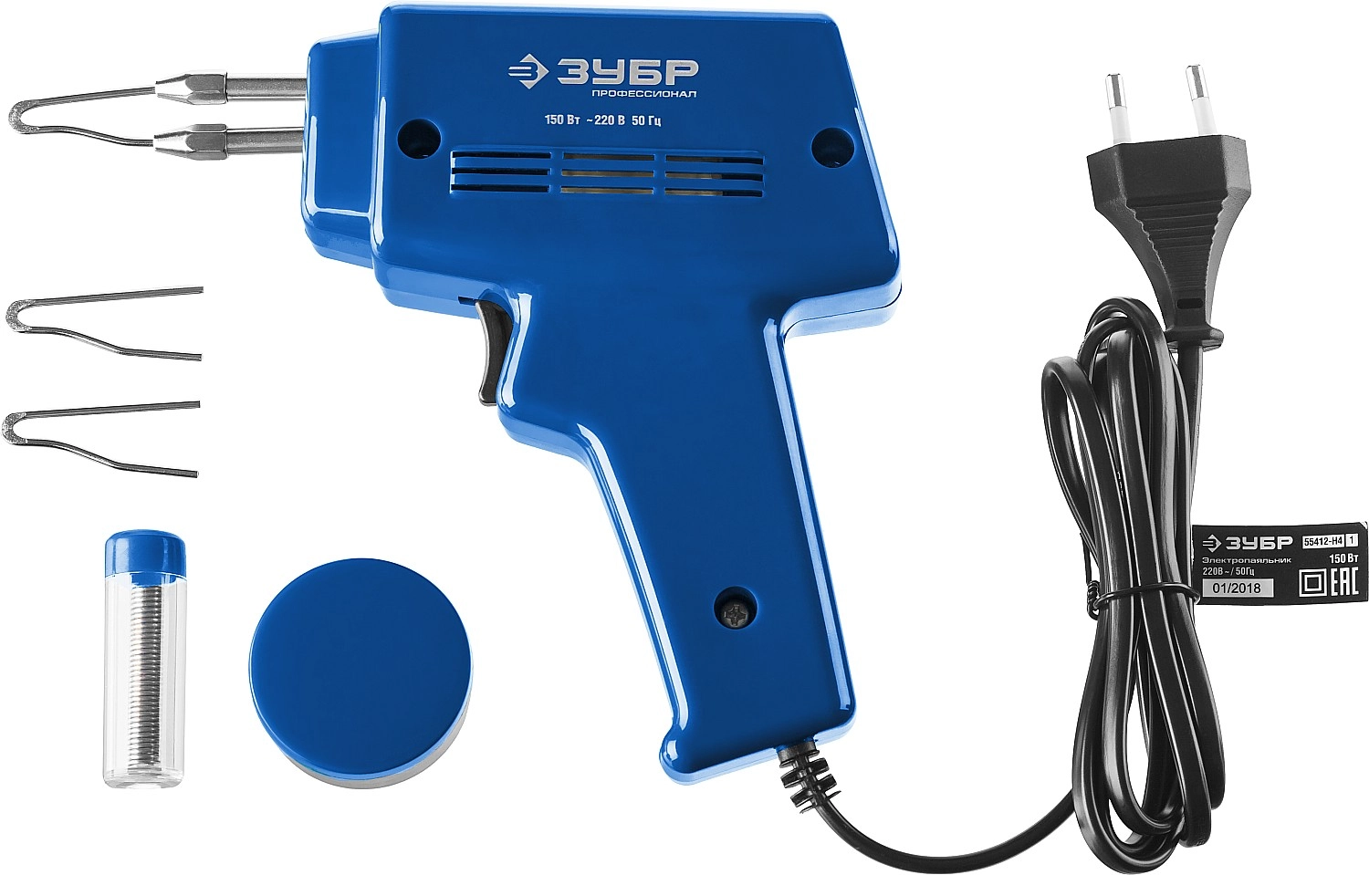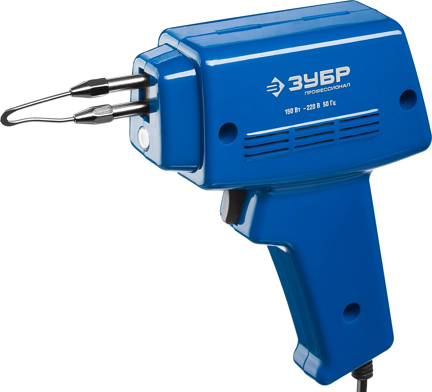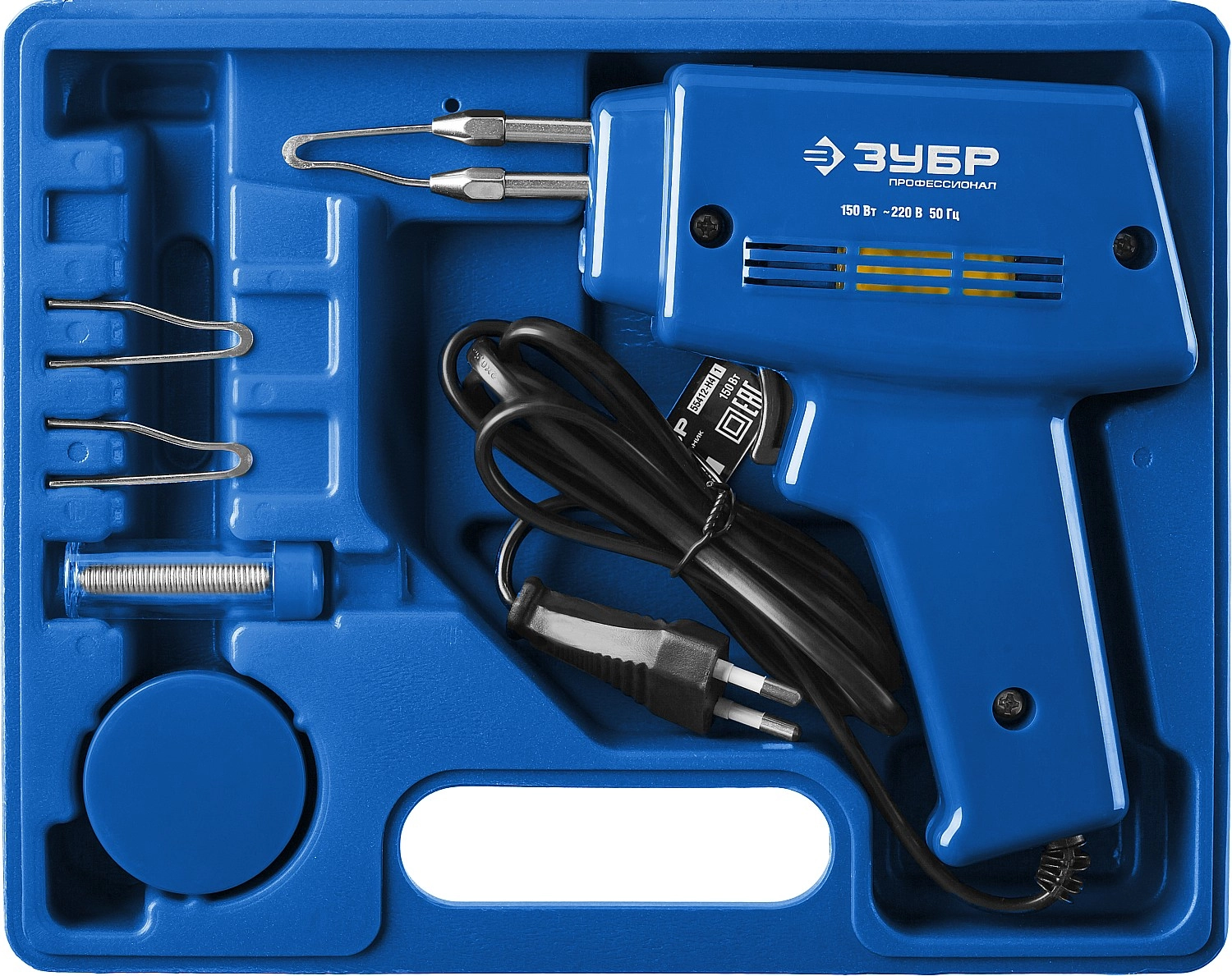 ПроизводителиИмпульсный паяльник ЗУБР "ПРОФЕССИОНАЛ" в наборе, 2 сменных жала, канифоль, припой, 150Вт