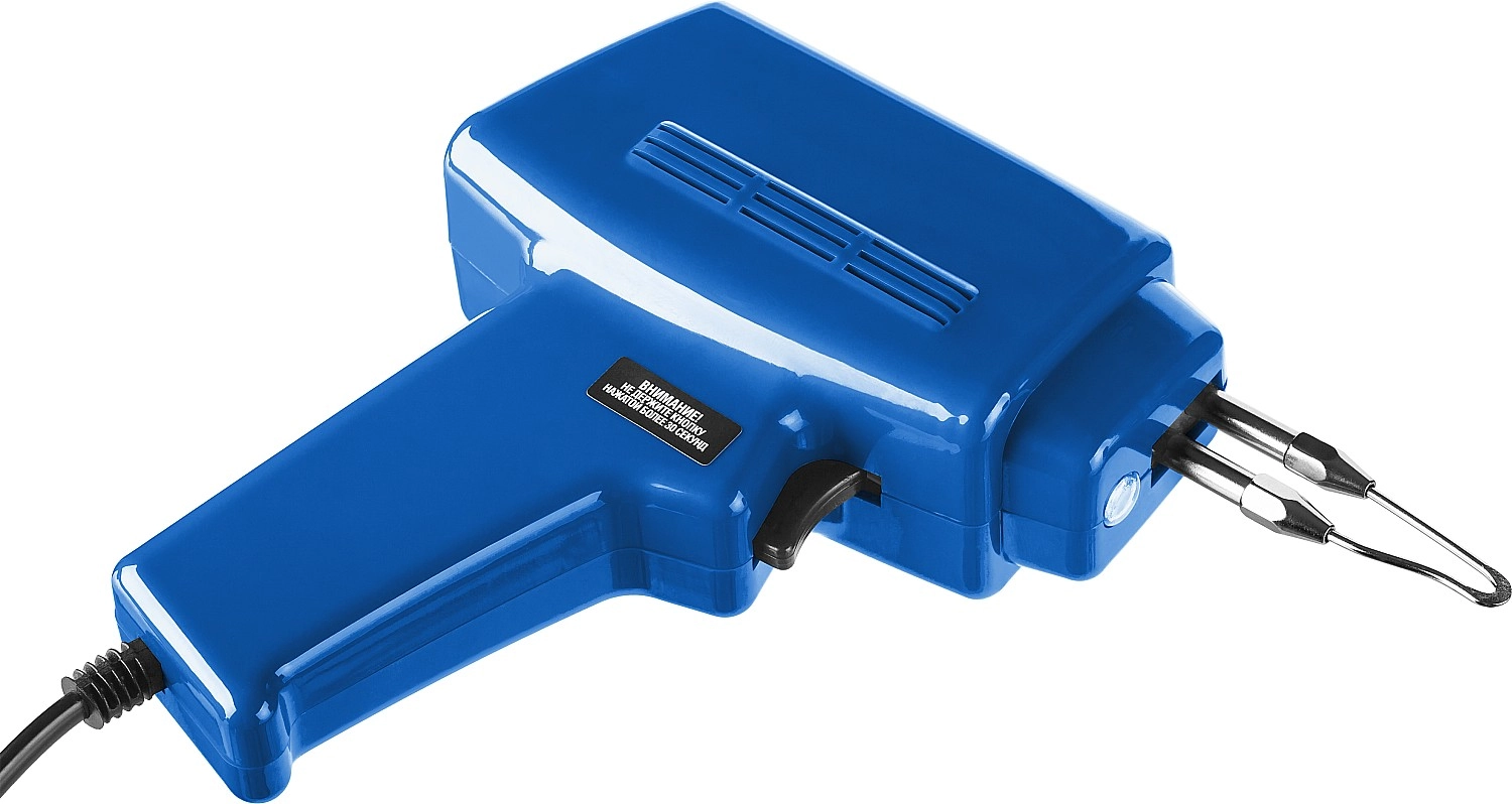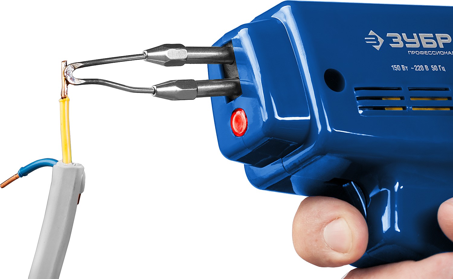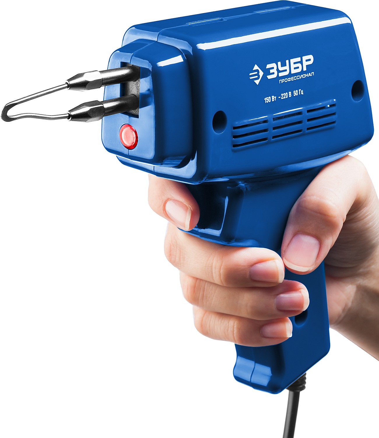 ПроизводителиИмпульсный паяльник ЗУБР "ПРОФЕССИОНАЛ" в наборе, 2 сменных жала, канифоль, припой, 150Вт