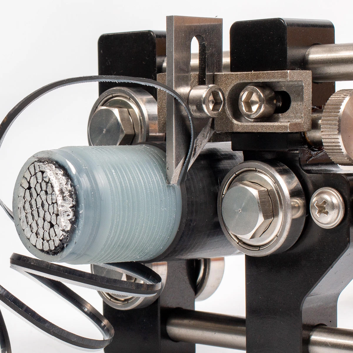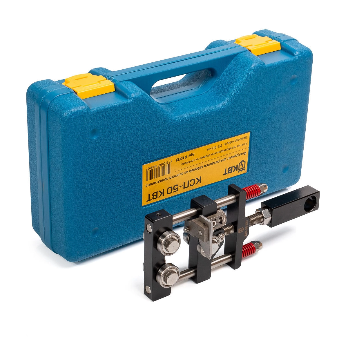 Характеристики КВТ КСП-50: Диаметр кабелей: 23-50 мм Чистое и аккуратное снятие полупроводящего экрана по изоляции Постоянное усилие прижима за счет пружин Прижим кабеля вращением рукоятки. 6 прижимных роликов Вес: 780 кг Длина: 225 мм Упаковка: прочный пластиковый кейс Габариты кейса: 275х220х65 мм Характеристики