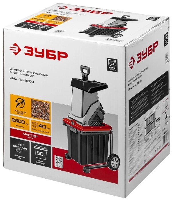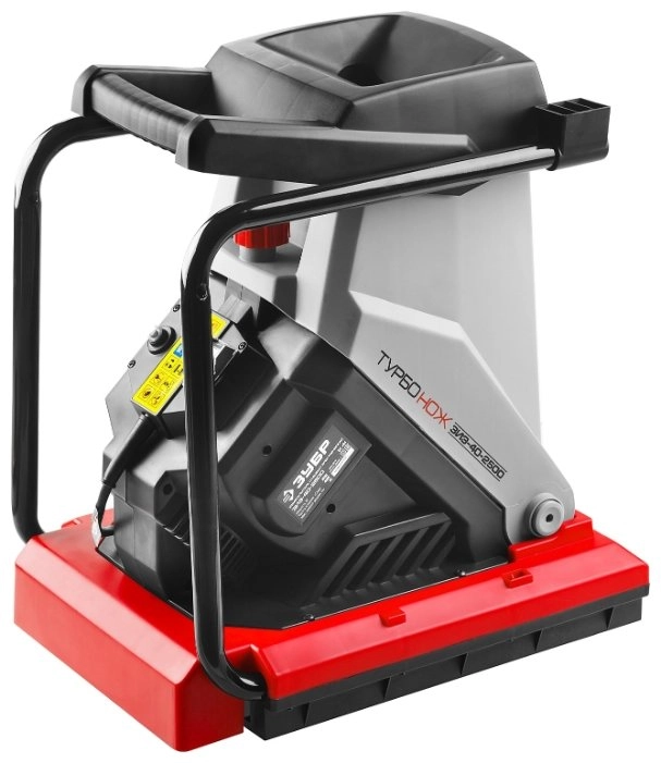 ХарактеристикиАртикул ЗИЭ-40-2500Бренды ЗубрСтрана производства КитайУровень звукового давления, дБ(A) 95.7Уровень звуковой мощности, дБ(A) 108,3Диаметр веток макс., Мм 40Скорость вращения 4050Объем травосборника, л 50Производительность 100Напряжение 220Тип двигателя электрическийВес 16Макс. толщина веток 40Режущий инструмент ножиКонтейнер ДаДлина 48.5Ширина 38.5Высота 55.5Объем приемного бункера 50Уровень звуковой мощности 108Материал пластикПропускная способность 100Описание товара обновлено 08.12.2025 15:02:51Измельчитель садовый электрический ЗУБР ЗИЭ-40-280, предназначен для измельчения отходов растительного происхождения (веток, листьев, скошенной растительности). Мощный двигатель с большим крутящим моментом, оснащенный редуктором. Режущие ножи из закаленной стали с двухсторонней заточкой обеспечивают отличную режущую способность с сохранением режущих свойств и длительное использование благодаря возможности перестановки. Удобный толкатель для безопасной подачи отходов. Ременный редуктор для исключения повреждений двигателя при заклинивании вала. Пластиковый контейнер большого объема для удобного сбора продуктов измельчения. Защита двигателя от перегрузки. Блокировка включения при снятом загрузочном устройстве. Рама-трансформер для компактного хранения. Колеса большого диаметра увеличивают мобильность и облегчают эксплуатацию изделия.