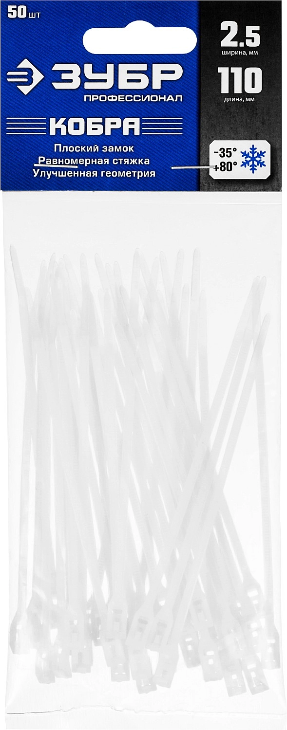 ПроизводителиХомут стяжка нейлон Ø 2.5x110 мм белый плоский замок 50шт. (30930-25-110) ЗУБР