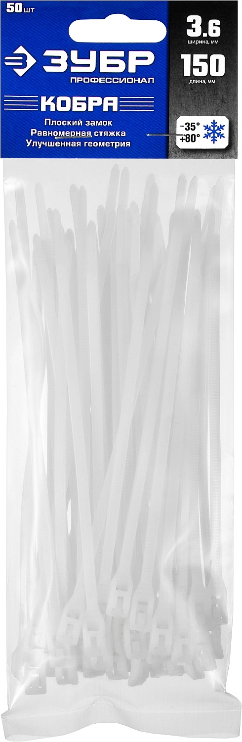 ПроизводителиХомут стяжка нейлон Ø 3.6x150 мм белый плоский замок 50шт. (30930-36-150) ЗУБР