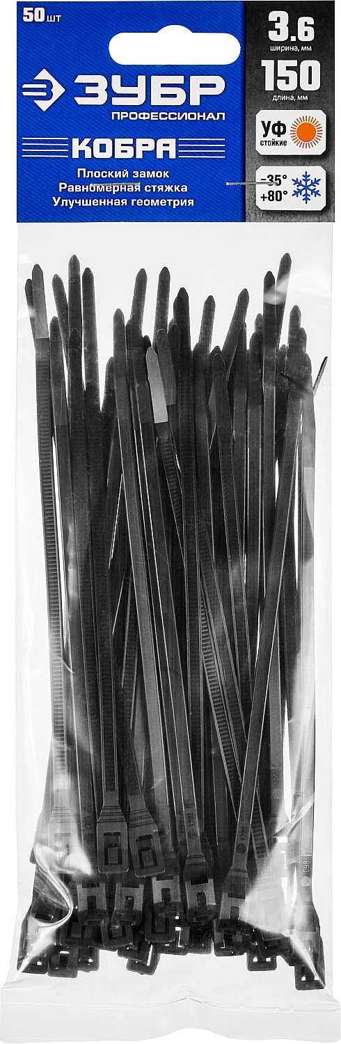 ПроизводителиХомут стяжка нейлон Ø 3.6x150 мм черный плоский замок 50шт. (30935-36-150) ЗУБР