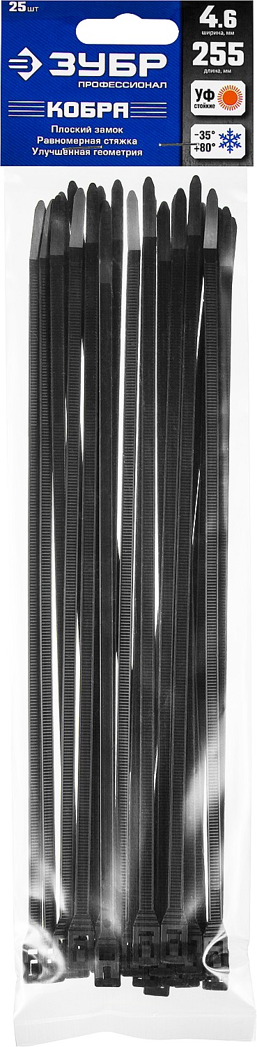 ПроизводителиХомут стяжка нейлон Ø 4.6x255 мм черный плоский замок 25шт. (30935-46-255) ЗУБР