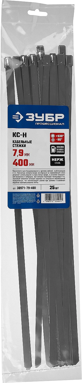 ПроизводителиХомут стяжка A2 Ø 7.9x400 мм 25шт. (30971-79-400) ЗУБР