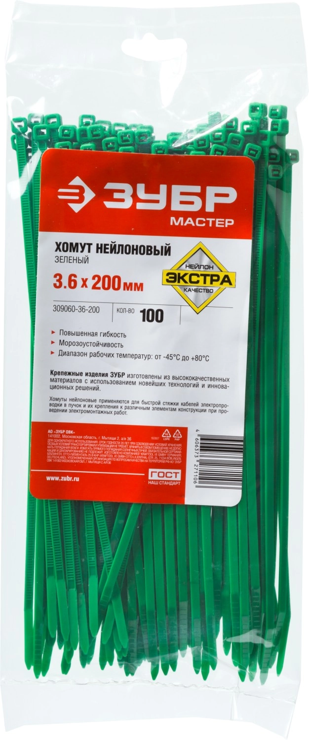 ПроизводителиХомут стяжка нейлон Ø 3.6x200 мм зеленый 100шт. (309060-36-200) ЗУБР