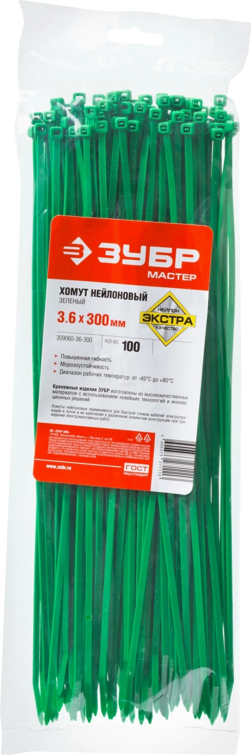 ПроизводителиХомут стяжка нейлон Ø 3.6x300 мм зеленый 100шт. (309060-36-300) ЗУБР