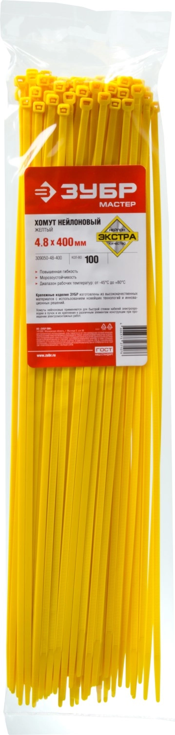 ПроизводителиХомут стяжка нейлон Ø 4.8x400 мм желтый 100шт. (309050-48-400) ЗУБР