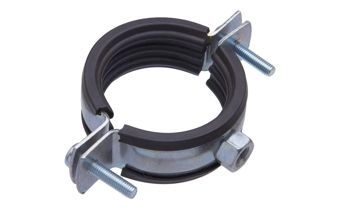 Конструкция сантехнического хомута- состоит из двух металлических скоб, которым методом штамповки придают полукруглую форму с ребрами жесткости. Скобы фиксируются между собой с помощью винтового соединения. Сами скобы металлического хомута выполнены из оцинкованной стали. Кроме этого трубный хомут имеет резиновый вкладыш, (разделенный на две части), который выполнен из качественно пористого материала. Что позволяет получить отличную звуковую и виброизоляцию. Одна из скоб имеет гайку, приваренную в заводских условиях. В эту гайку вворачивается металлическая шпилька или как ее еще называют «сантехнический болт». Кроме этого к шпильке прилагается пластиковый дюбель, для надежного крепления трубопроводов к вертикальной стене, потолку или к другим различным элементам и конструкциям.