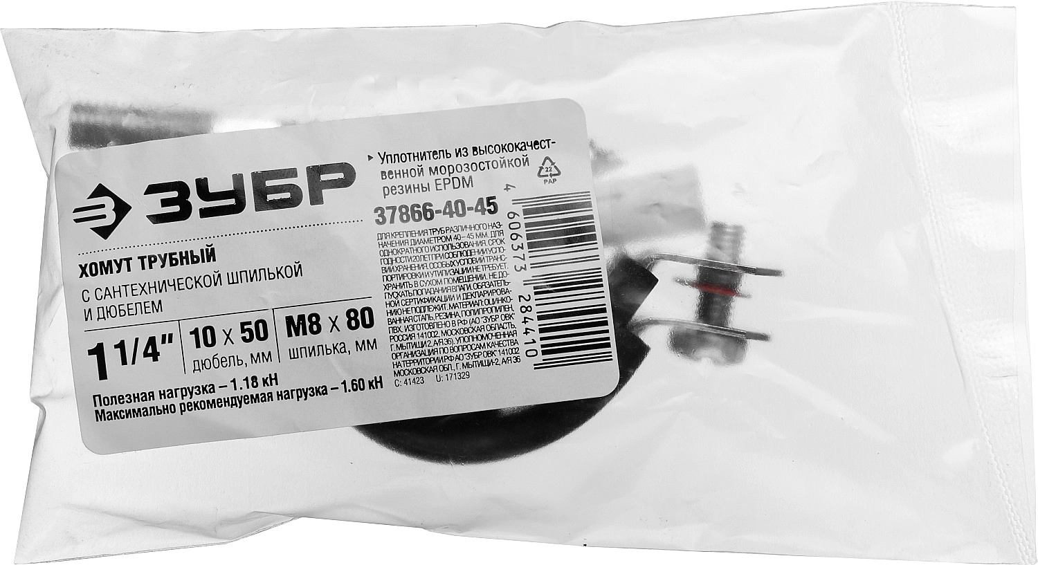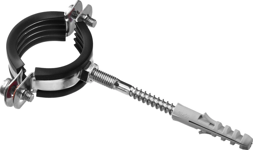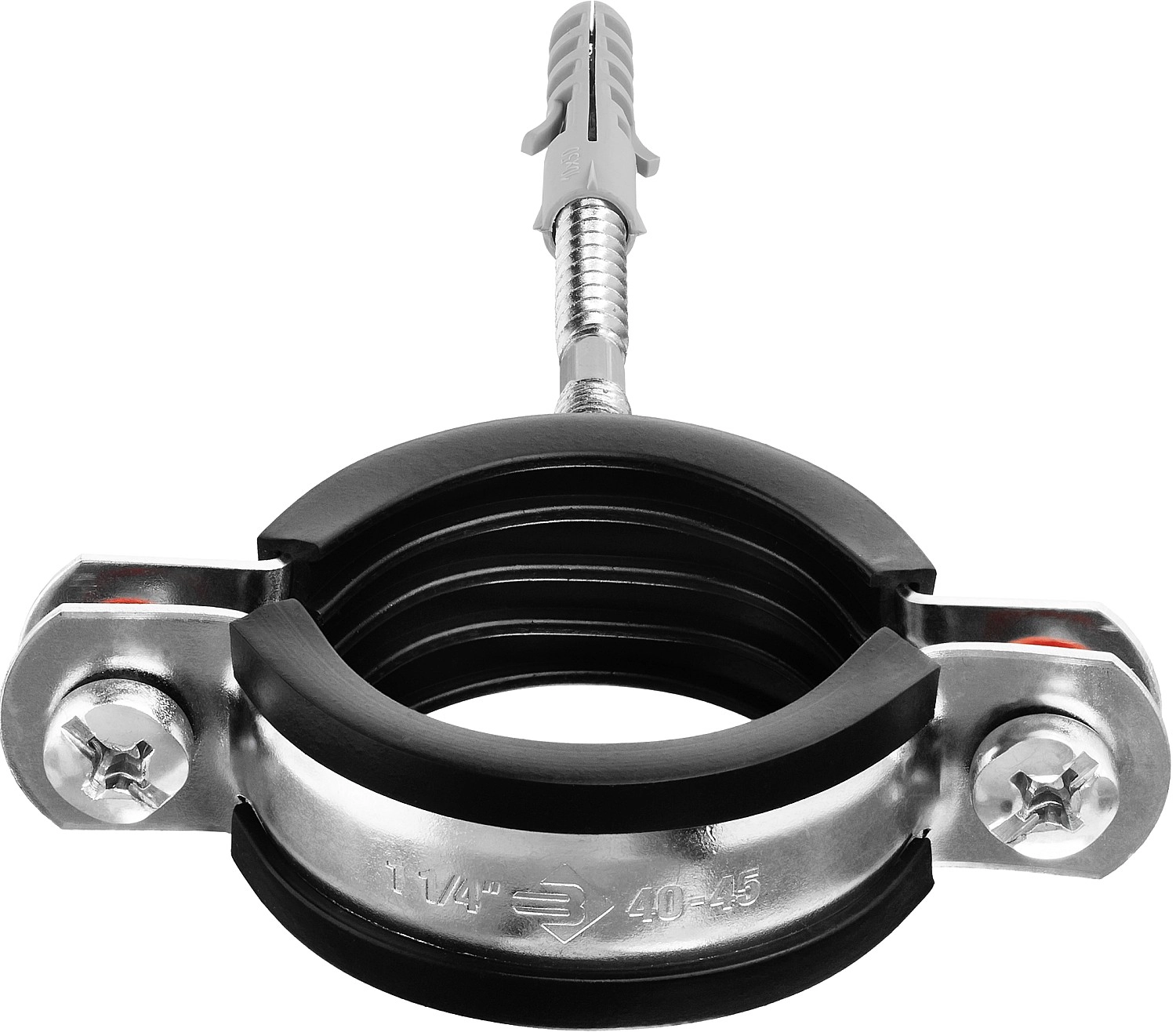 ПроизводителиХомут трубный 1 1/4, в комплекте с сантехнической шпилькой и дюбелем (37866-40-45) ЗУБР