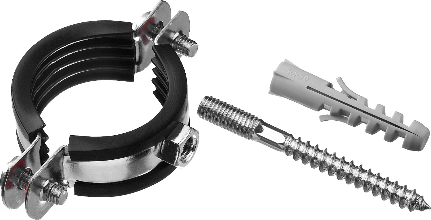 - Комплектность набора позволяет крепить хомут как с помощью гайки, так и с использованием шпильки и дюбеля