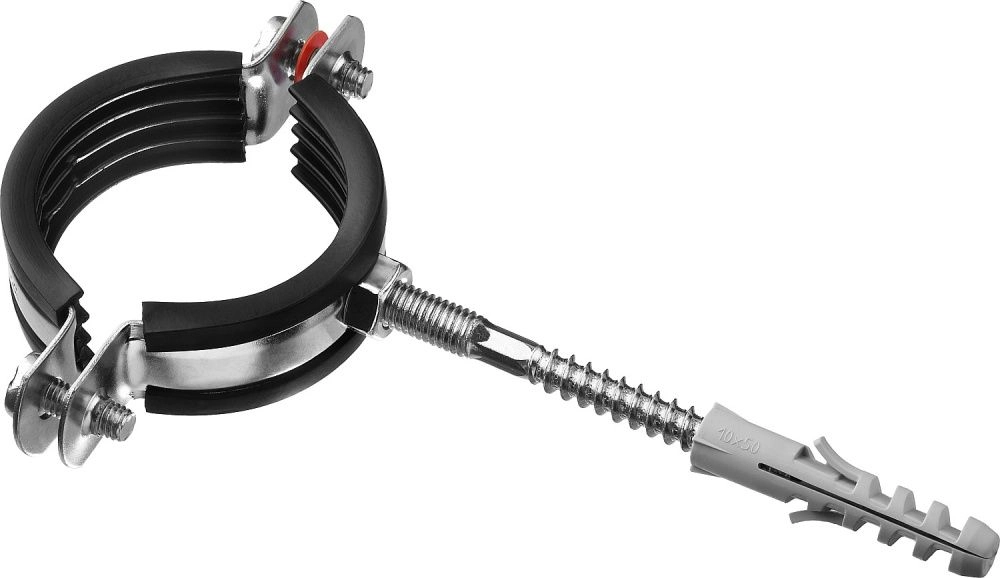 ПроизводителиХомут трубный с гайкой, оцинк., комплект шпилька и дюбель 1 1/2", 1шт. (37866-47-52) ЗУБР