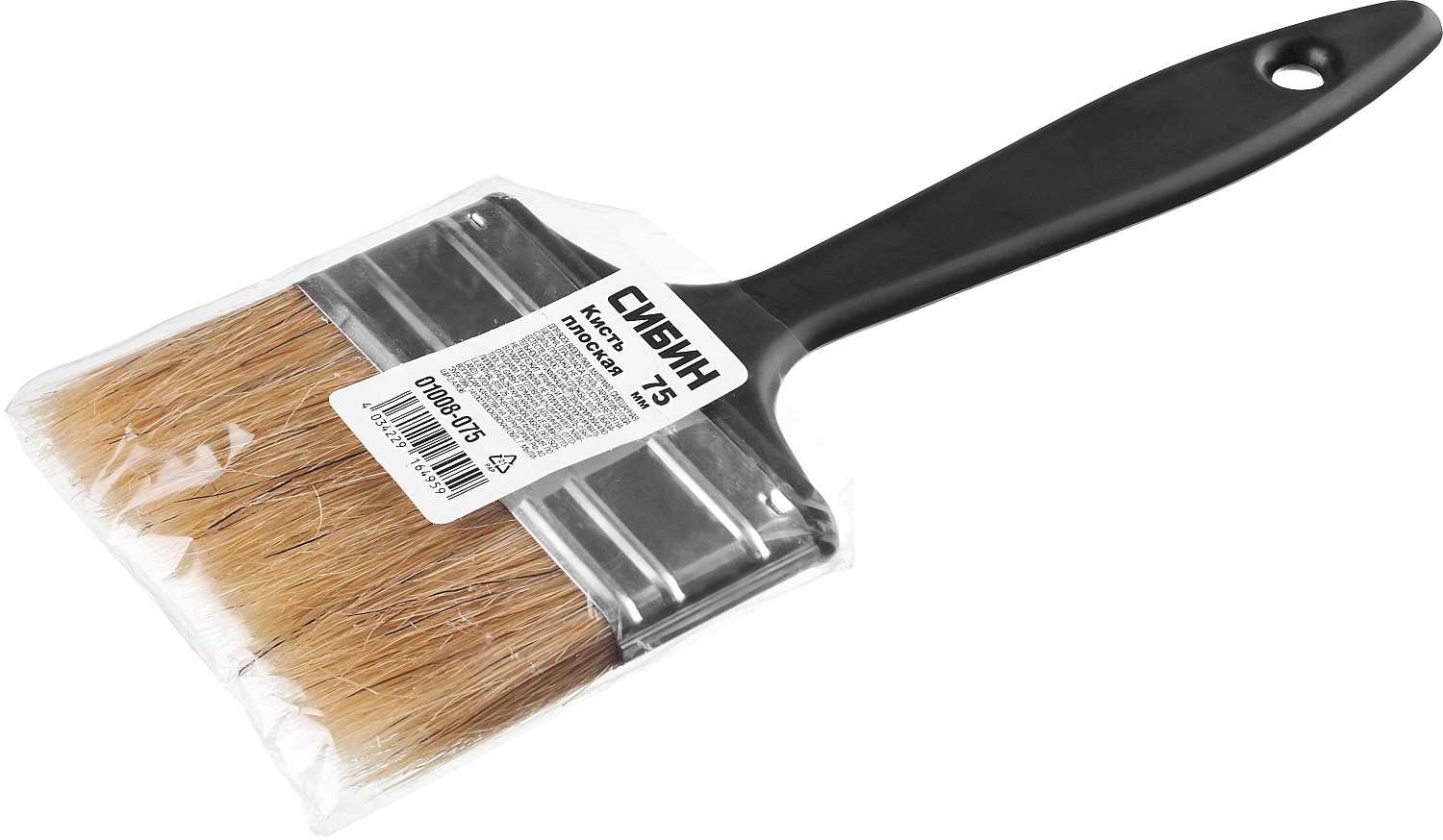 ПроизводителиКисть плоская 75мм, натур. светл. щетина, пласт. ручка (01008-075) СИБИН