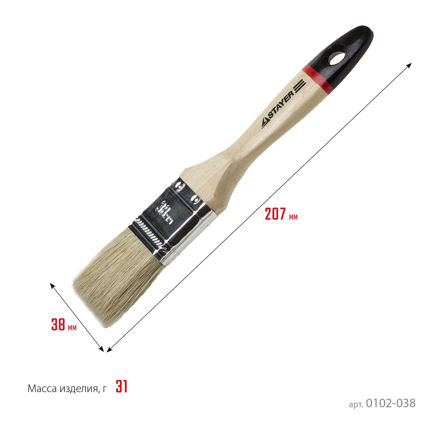 ПроизводителиКисть плоская 38мм, натур. щетина, толщ. ворса 15мм, дер. ручка "UNIVERSAL-EURO" (0102-038) STAYER