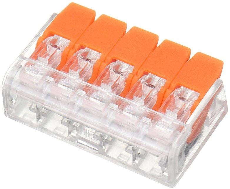 Строительно-монтажная клемма СМК 221-415 ETP имеет 5 отверстий. К данной клемме можно подключитьмедные или алюминиевые проводники с сечением 0,08-4мм2. Используется в цепях переменного тока с частотой50 Гц и напряжением до 400 В. Корпус клемм изготовлен из пластика не распространяющего горение, контактная часть: из луженой латуни, что дает возможность подсоединять как алюминиевые, так и медные проводники.