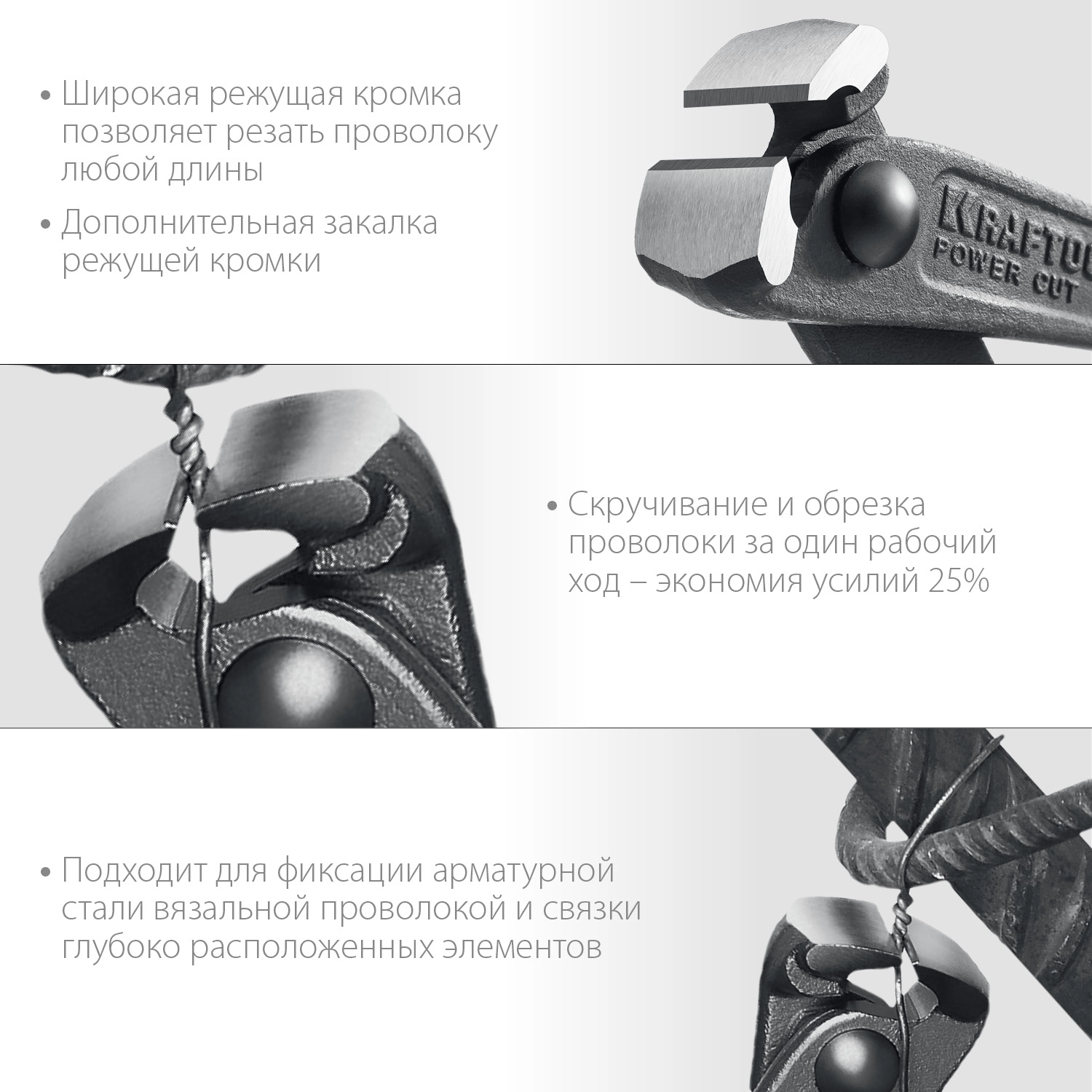 - Широкая режущая кромка позволяет резать проволоку любой длины