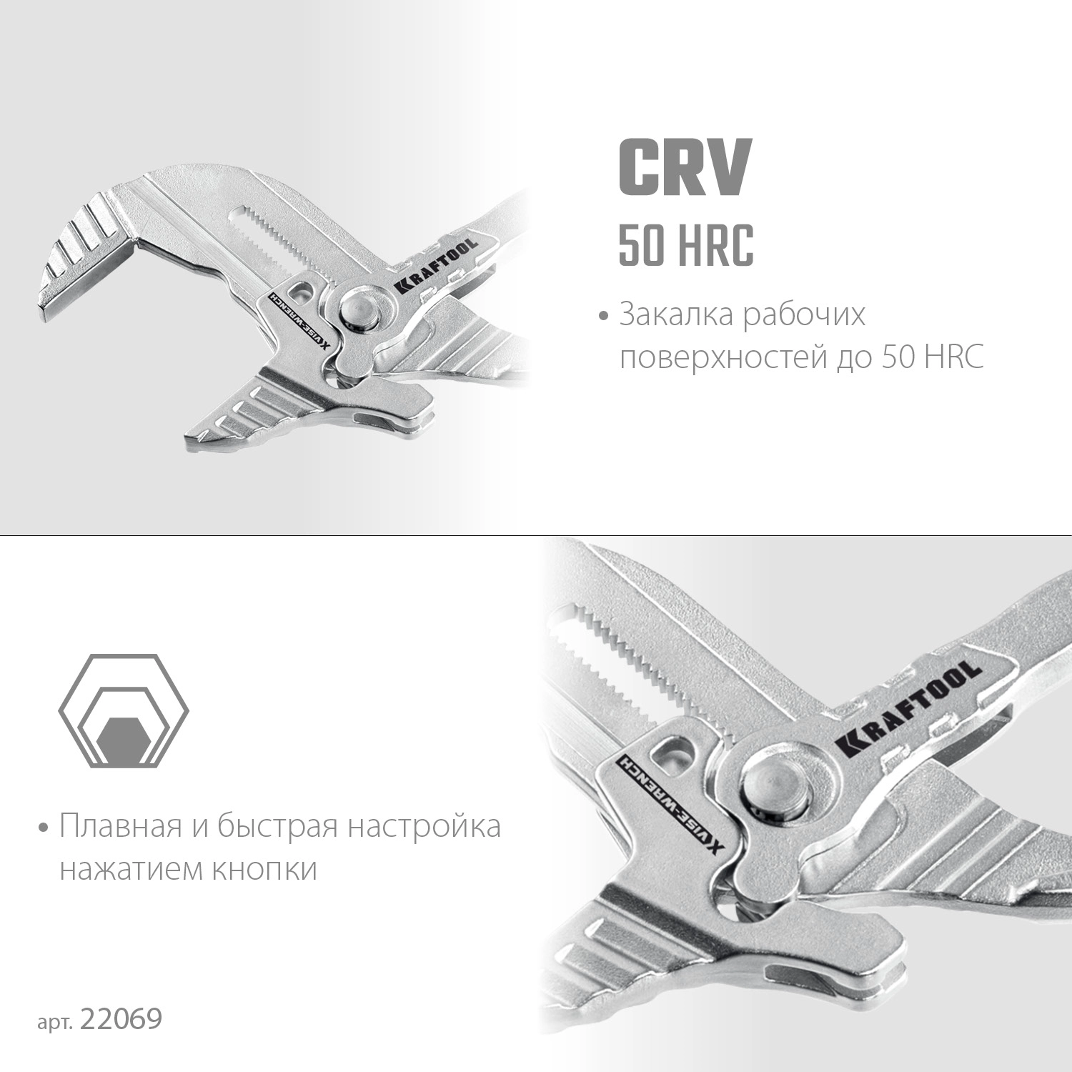 Клещи переставные-гаечный ключ KRAFTOOL 22069 предназначены для монтажа и демонтажа крепежных элементов. Защитные эластичные накладки для дополнительной защиты крепежа. Ход захватных губок обеспечивает быстрое затягивание и ослабление винтовых крепежей по принципу трещетки. Плавная и быстрая настройка нажатием кнопки. Не повреждает грани хромированных деталей, благодаря плотному прилеганию параллельно сводимых захватных губок. Уникальная конструкция исключает случайную перестановку и проскальзывание шарнира. Удобные двухкомпонентные рукоятки. Подходит для сгибания и сдавливания обрабатываемых деталей. Высокая сила зажима благодаря 10-кратному увеличению усилиия на рукоятке. Рабочие поверхности закалены до 50 HRC.Производитель: Крафтул И/Е Гмбх, Альтер Поствег Штр., Лоенинген, Германия