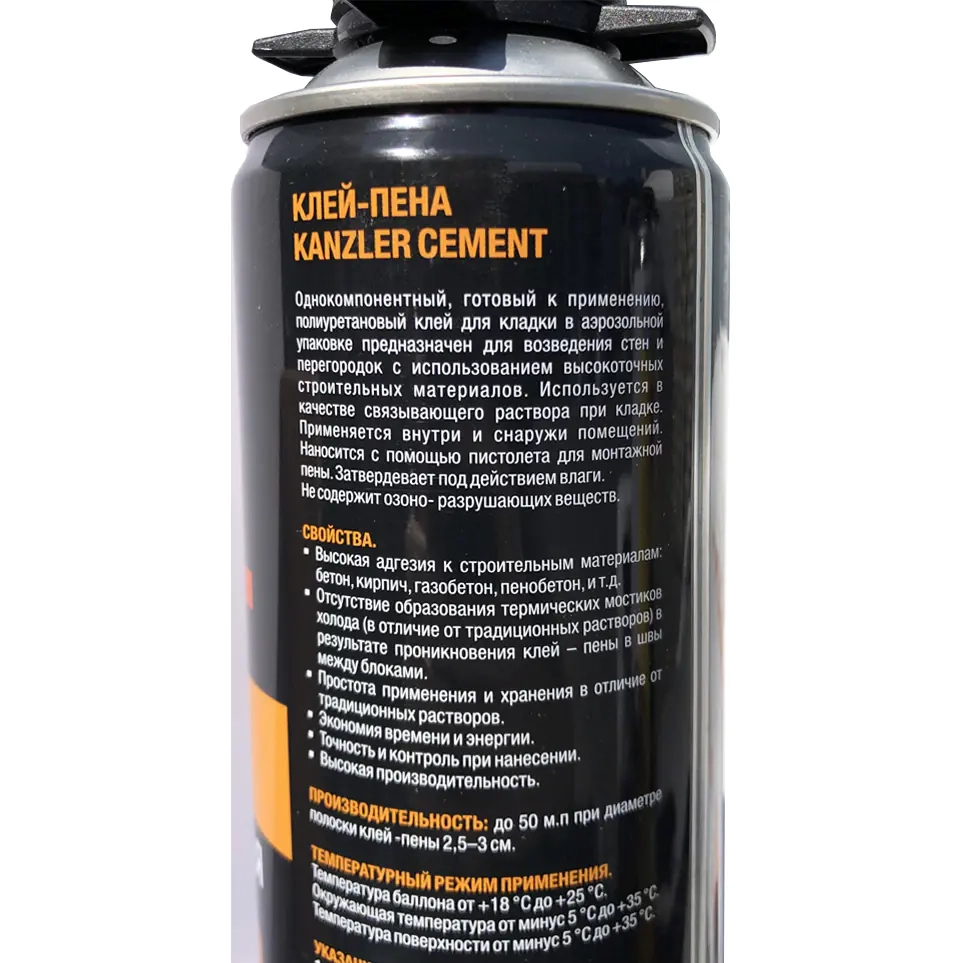 Клей-пена монтажная KANZLER Cement 850 мл — это однокомпонентный, готовый к применению, полиуретановый клей для кладки. Наносится с помощью пистолета для монтажной пены.