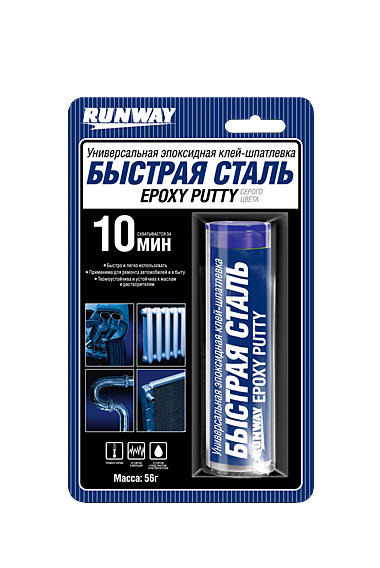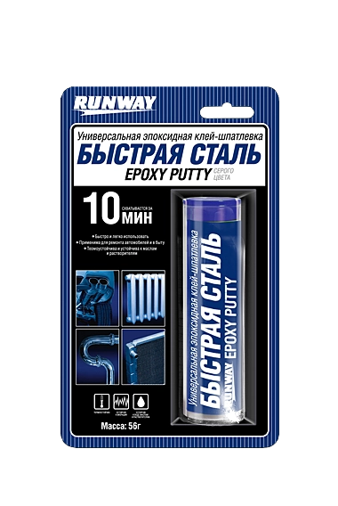 RUNWAY «Быстрая сталь» надежно и быстро склеивает различные материалы – металл, фарфор, стекло, керамику, дерево, пластик. Применяется для ремонта и восстановления большого числа изделий: радиатора, глушителя, аккумулятора, картера, корпусных и кузовных деталей. Также может применяться в быту для ремонта: мебели, сантехники, труб горячей и холодной воды, инструментов, аквариумов, зеркал и многого другого. Возможен ремонт под водой. RUNWAY «Быструю сталь» легко использовать для изготовления отломанных или потерянных деталей методом лепки. Обладает хорошими изоляционными свойствами. Устойчива к воздействию химических растворителей, бензина, воды и ультрафиолетовым лучам, выдерживает высокую температуру до 260С. Схватывается за 10 минут, отвердевает за 20 минут, конечная прочность склеивания достигается за час. После отвердевания шпатлевки поверхности можно сверлить, нарезать в них резьбу, обтачивать, шкурить, красить.Производитель: ЗАО ТК «ПОИСК», ул. Магнитогорская, д. 51 Ж, офис 344 (3 этаж), г. Санкт-Петербург, РФ