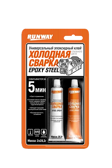 RUNWAY «Холодная сварка» предназначена для быстрого и надежного ремонта и склеивания материалов в любых сочетаниях: все виды металлов и их сплавы, фарфор, стекло, керамика, дерево, пластик, бетон, камень и другие материалы. Схватывается за 5 минут, отвердевает за 20 минут, конечная прочность склеивания достигается за час. Обладает хорошими изоляционными свойствами. Устойчива к воздействию химических растворителей, бензина, воды и ультрафиолетовым лучам. Не дает усадки и не деформируется. Обладает высокими прочностными характеристиками, выдерживает большие ударные и вибрационные нагрузки. После полного отверждения клея изделие можно подвергать дополнительной обработке: шлифовать, сверлить, обтачивать и красить. Способ применения: Очистите и обезжирьте поверхность от загрязнений. Тщательно смешайте два компонента в равной пропорции для получения однородного состава. Нанесите композицию на ремонтируемые дПроизводитель: ЗАО ТК «ПОИСК», ул. Магнитогорская, д. 51 Ж, офис 344 (3 этаж), г. Санкт-Петербург, РФ