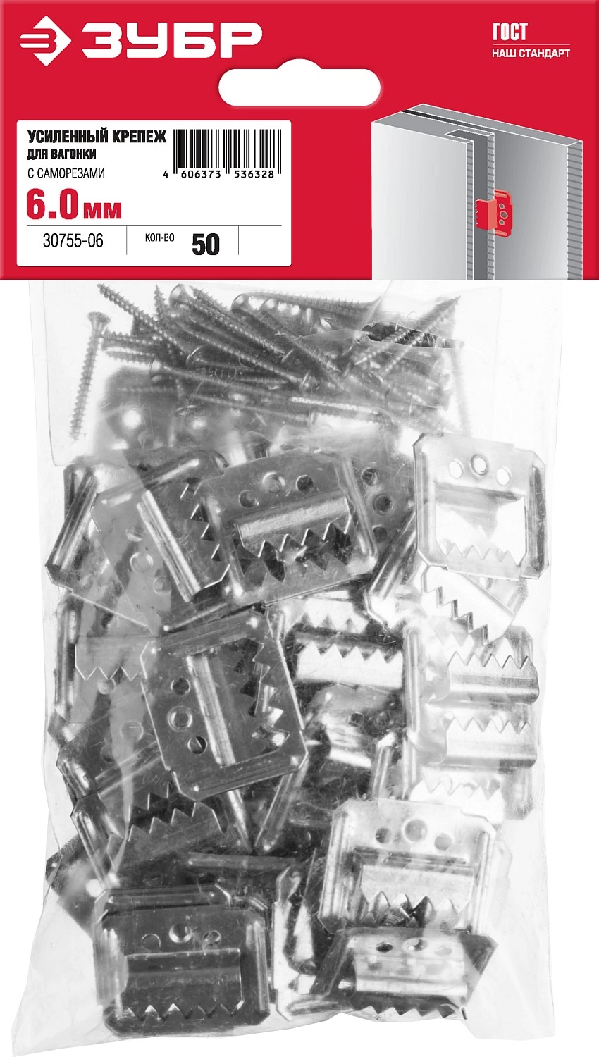 ПроизводителиКляймер усиленный (крепеж для вагонки) 6мм, с саморезами, 50шт., "Кляймер-У2" (30755-06) ЗУБР