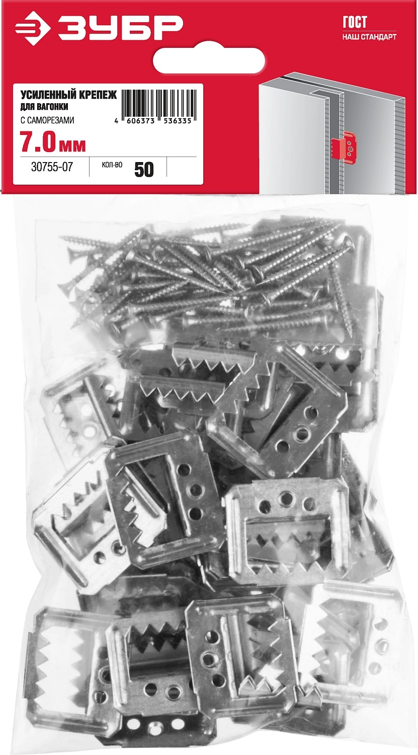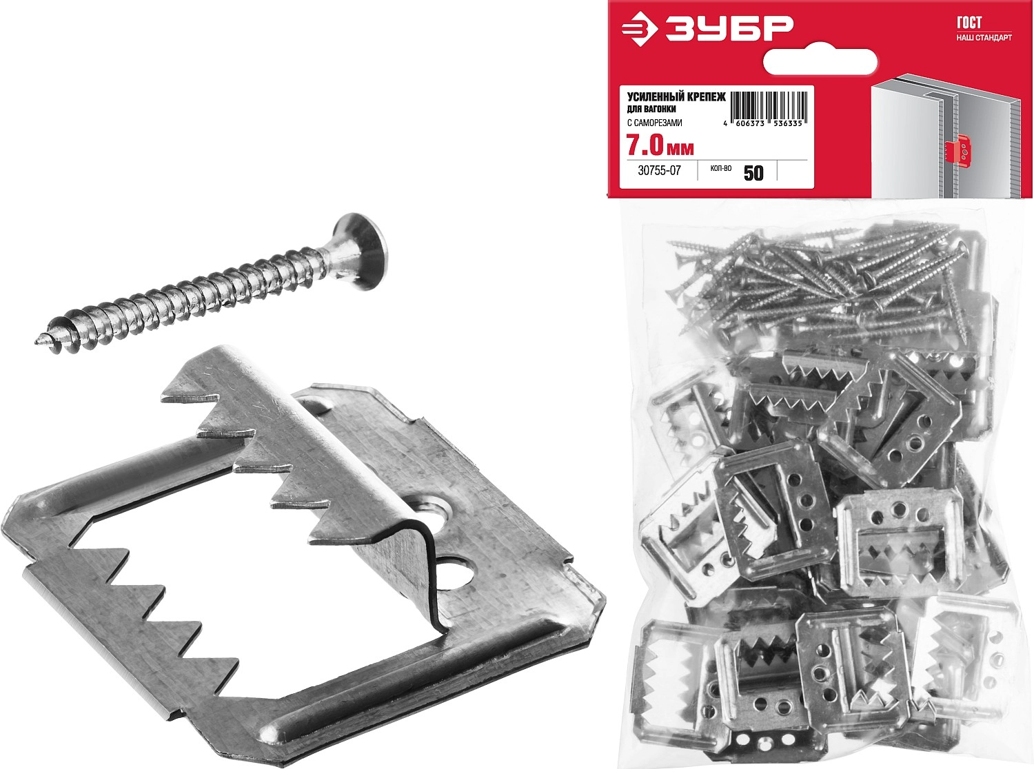 ПроизводителиКляймер усиленный (крепеж для вагонки) 7мм, с саморезами, 50шт., "Кляймер-У2" (30755-07) ЗУБР