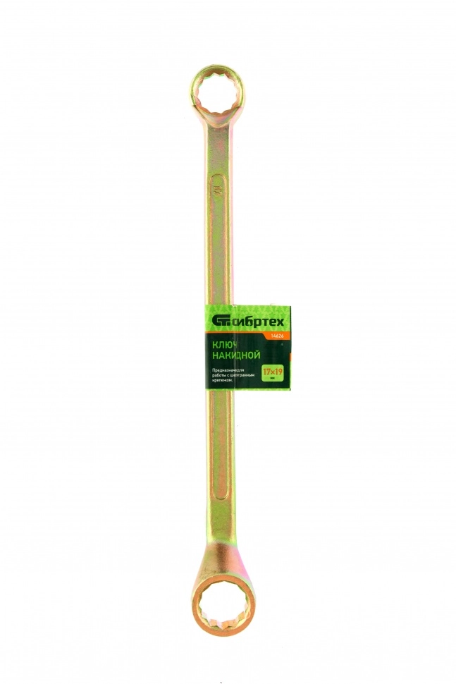 Накидной ключ Сибртех 14626 с покрытием из желтого цинка используется для монтажа и демонтажа резьбовых соединений с шестигранной головкой диаметром 17 и 19 мм.