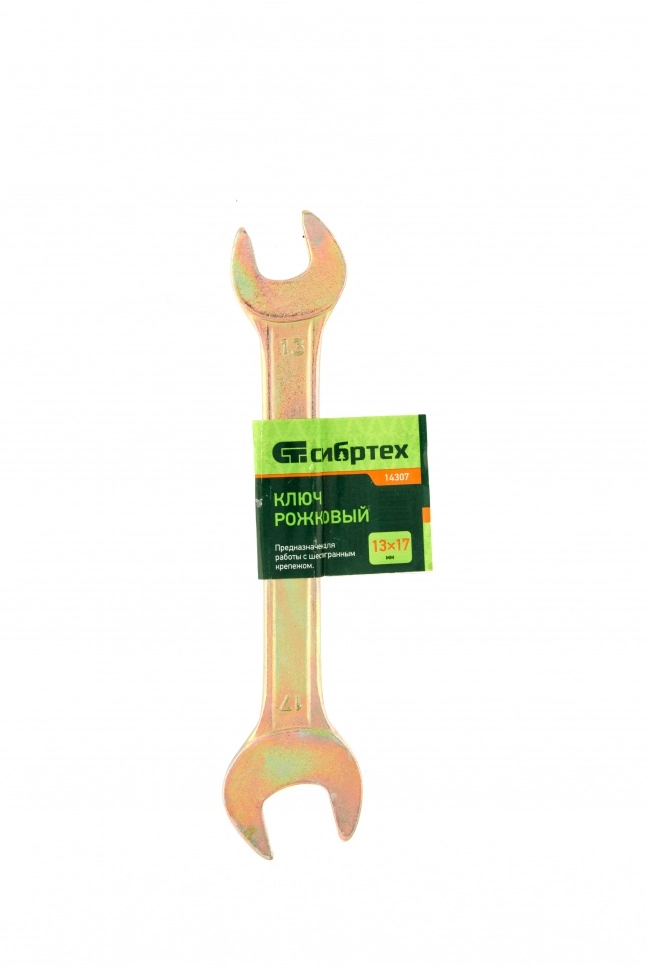 Рожковый ключ Сибртех 14307, 13 х 17 мм, с покрытием из желтого цинка, предназначен для закручивания и откручивания резьбовых крепежей с шестигранными головками.