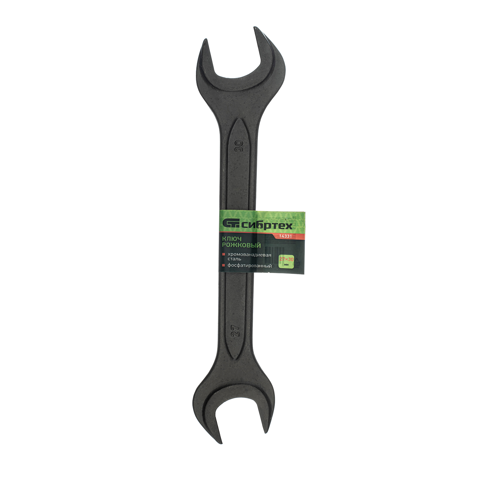 Фосфатированный рожковый ключ Сибртех 14331, 27 х 30 мм, из стали CrV, ГОСТ 2839, используется для монтажа и демонтажа шестигранных резьбовых крепежей.