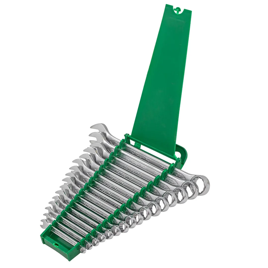 Ключи комбинированные – универсальные гаечные ключи, совмещающие в себе функционал и преимущества рожковых и накидных ключей. Зевы комбинированных ключей имеют одинаковые размеры. Ключи гаечные с открытым и кольцевым зевами предназначены для монтажа либо демонтажа резьбовых соединений. Набор изготовлен из высококачественной стали Cr-V.