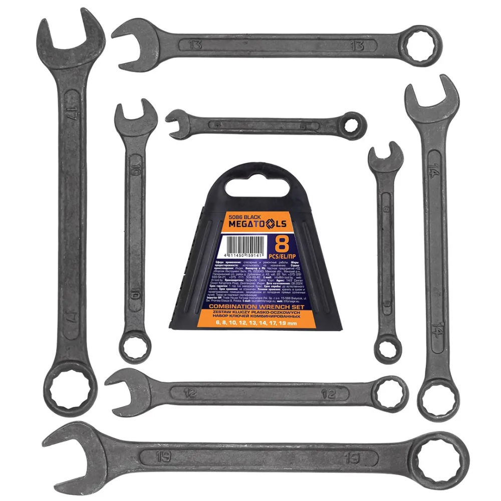 ПроизводителиКлючи комбинированные, 8пр. (6, 8, 10, 12-14, 17, 19мм) (MT-5086 BLACK) MEGATOOLS