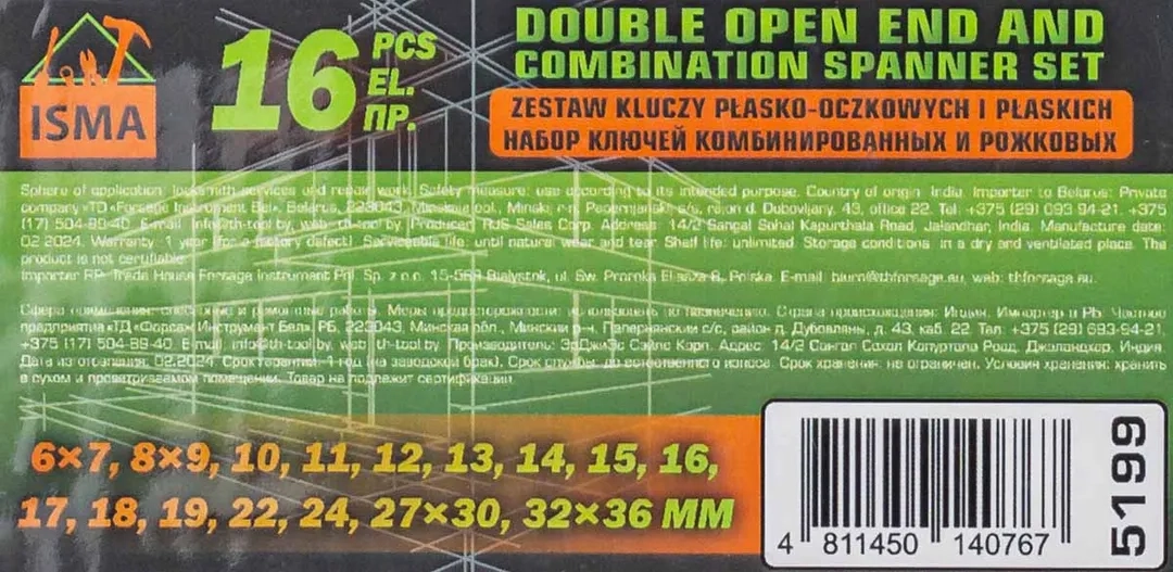 ПроизводителиКлючи комбинированные и рожковые, 16пр. 6-36мм, на полотне (ISMA-5199) ISMA
