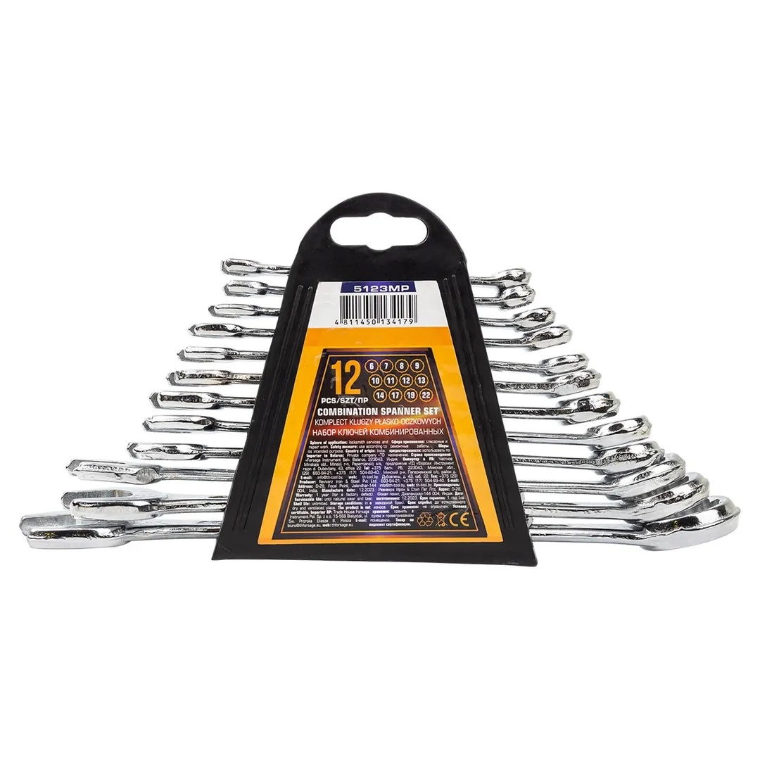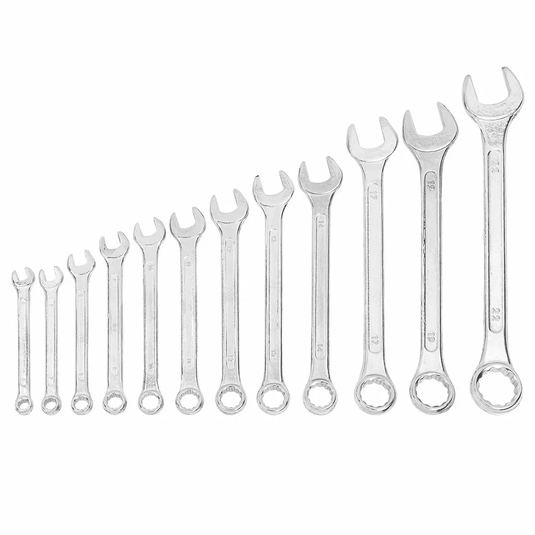 Ключи комбинированные – универсальные гаечные ключи, совмещающие в себе функционал и преимущества рожковых и накидных ключей. Зевы комбинированных ключей имеют одинаковые размеры. Ключи гаечные с открытым и кольцевым зевами предназначены для монтажа либо демонтажа резьбовых соединений. Набор изготовлен из высококачественной стали Cr-V.