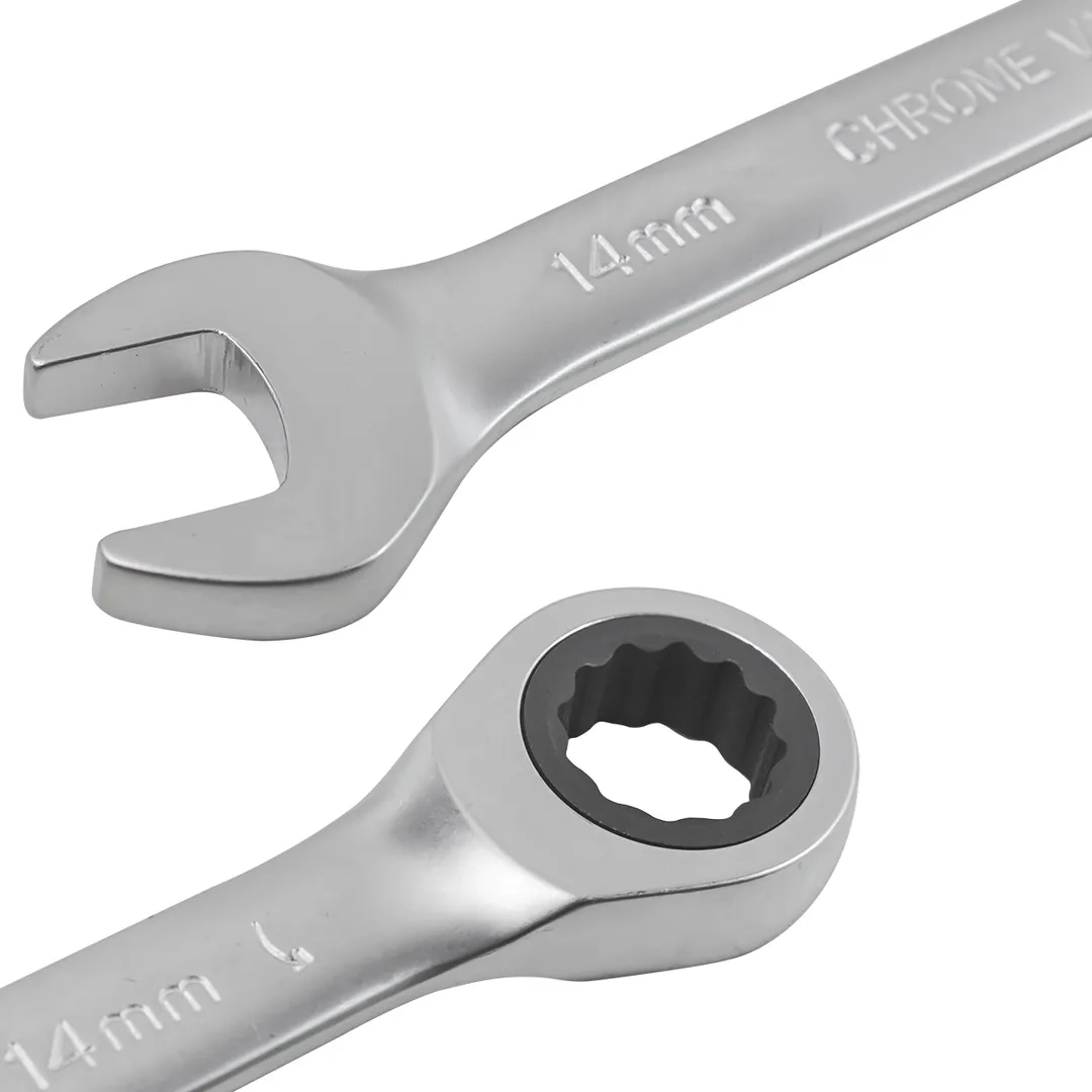 Ключи комбинированные – универсальные гаечные ключи, совмещающие в себе функционал и преимущества рожковых и накидных ключей. Зевы комбинированных ключей имеют одинаковые размеры. Ключи гаечные с открытым и кольцевым зевами предназначены для монтажа либо демонтажа резьбовых соединений. Набор изготовлен из высококачественной стали Cr-V. Трещоточный механизм в накидной части ключа позволяет комфортно работать в местах с ограниченным пространством