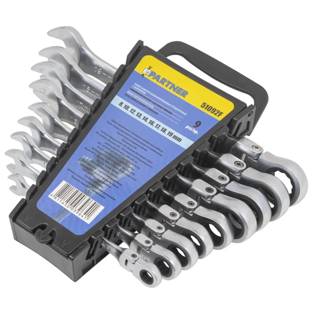 ПроизводителиКлючи комбинированные трещоточные с шарниром (8,10,12,13,14,16,17,18,19мм), 9пр. (PA-51092F) Partner