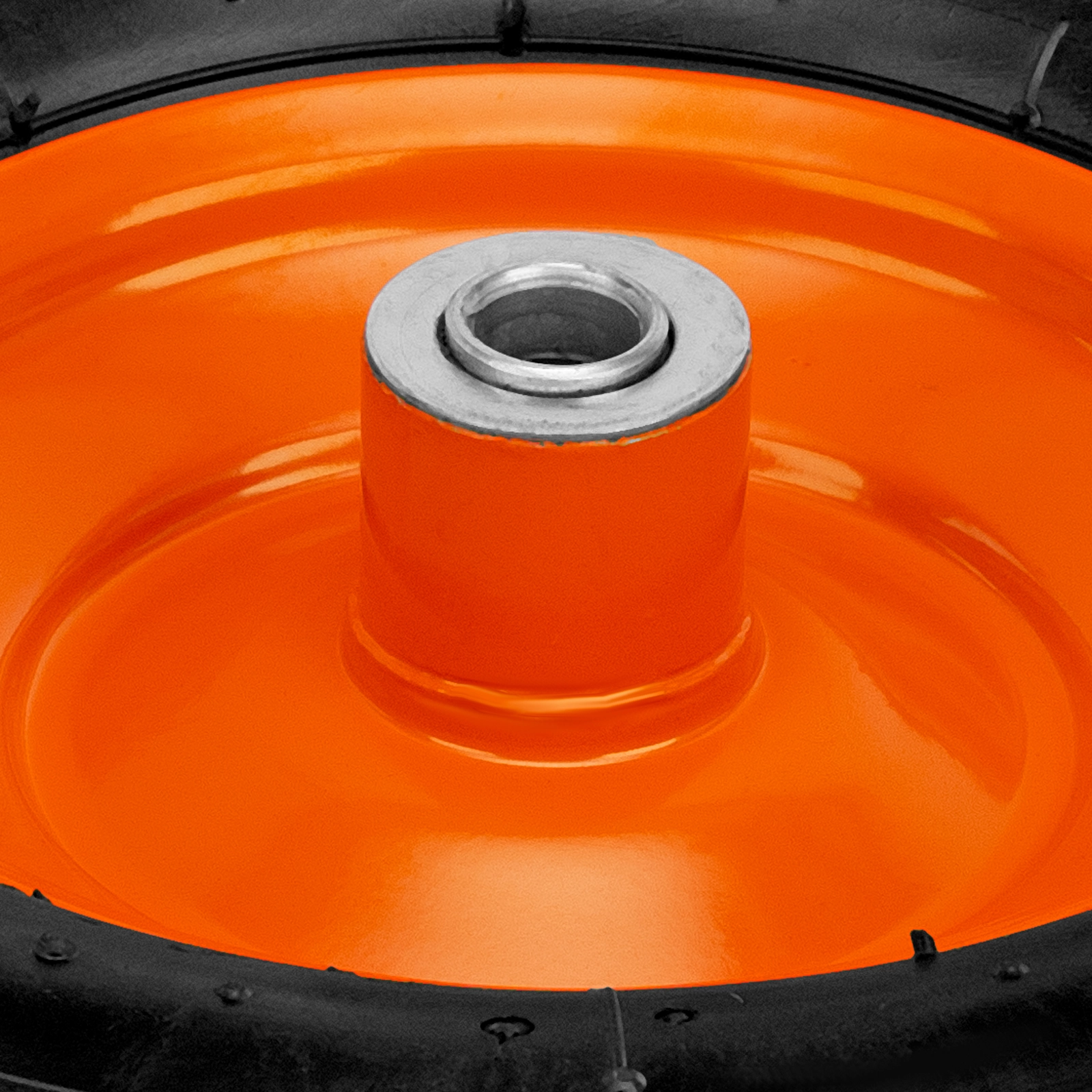 Колесо с шариковыми подшипниками обеспечивает высокую проходимость тачки и рассчитано на ежедневное использование на ровном или рыхлом грунте.