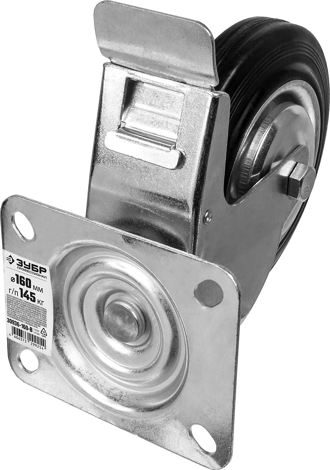 ПроизводителиКолесо поворотное c тормозом d=160 мм, г/п 145 кг, резина/металл, игольчатый подшипник, ЗУБР Професс