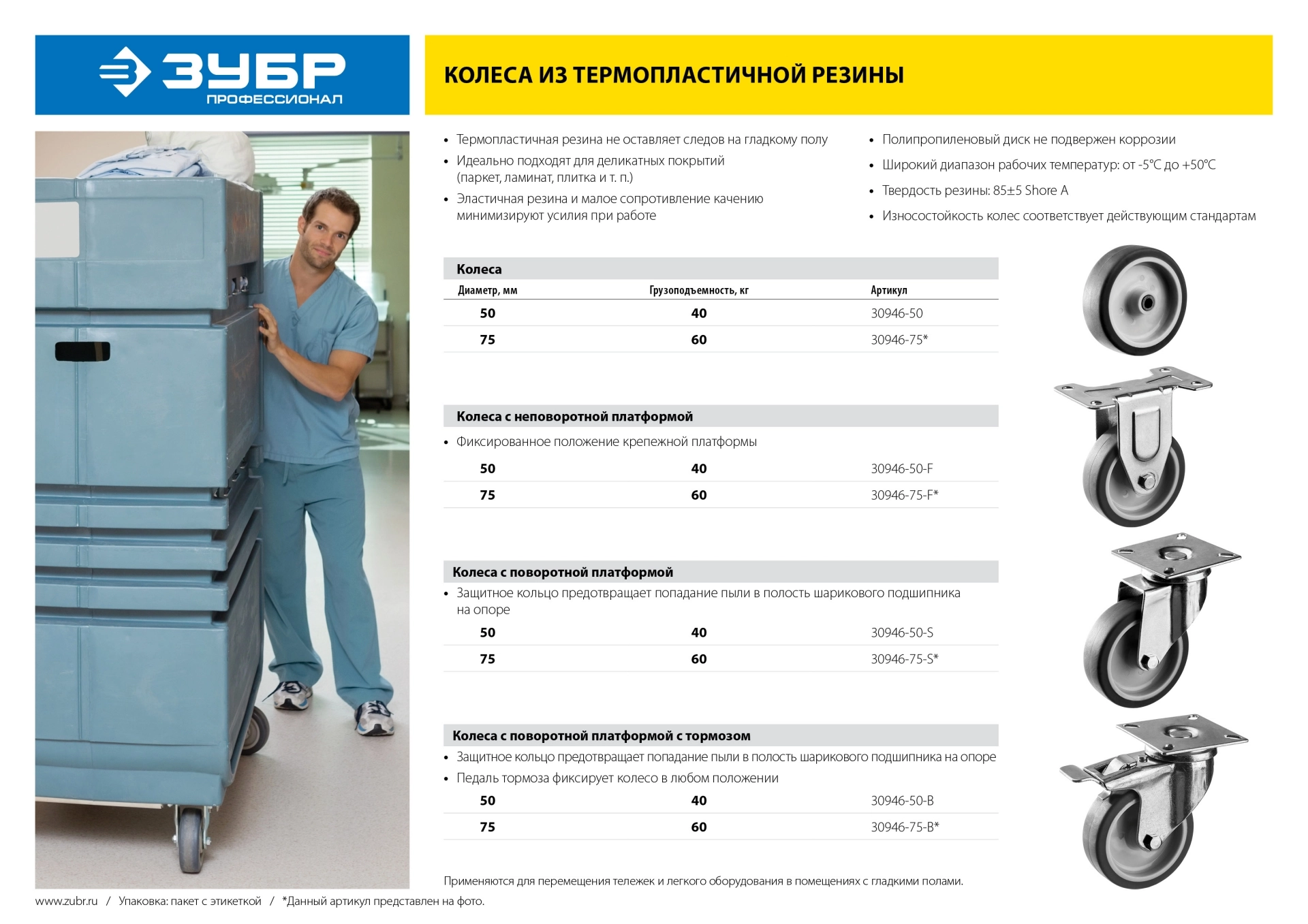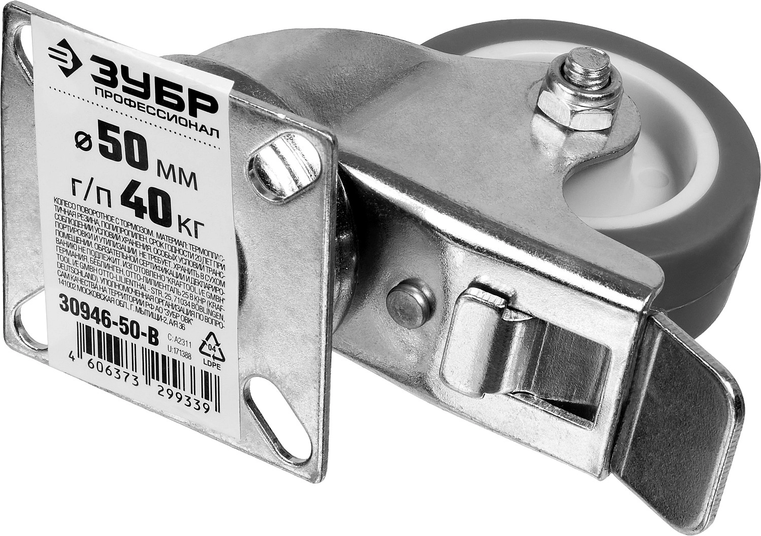 ПроизводителиКолесо поворотное с тормозом d=50 мм, г/п 40 кг, термопластич. резина/полипропилен, ЗУБР Профессиона