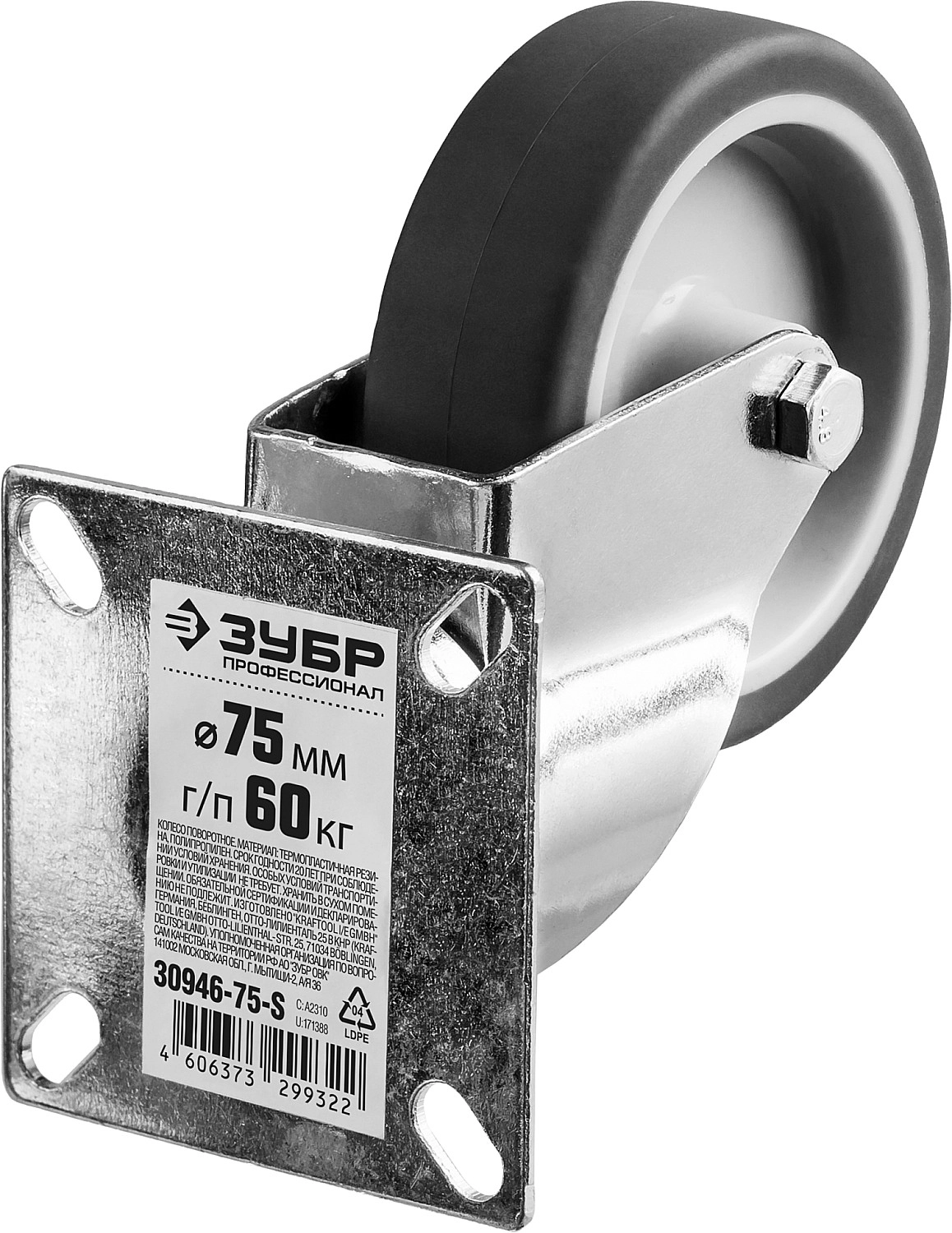 ПроизводителиКолесо поворотное d=75 мм, г/п 60 кг, термопластич. резина/полипропилен, ЗУБР Профессионал