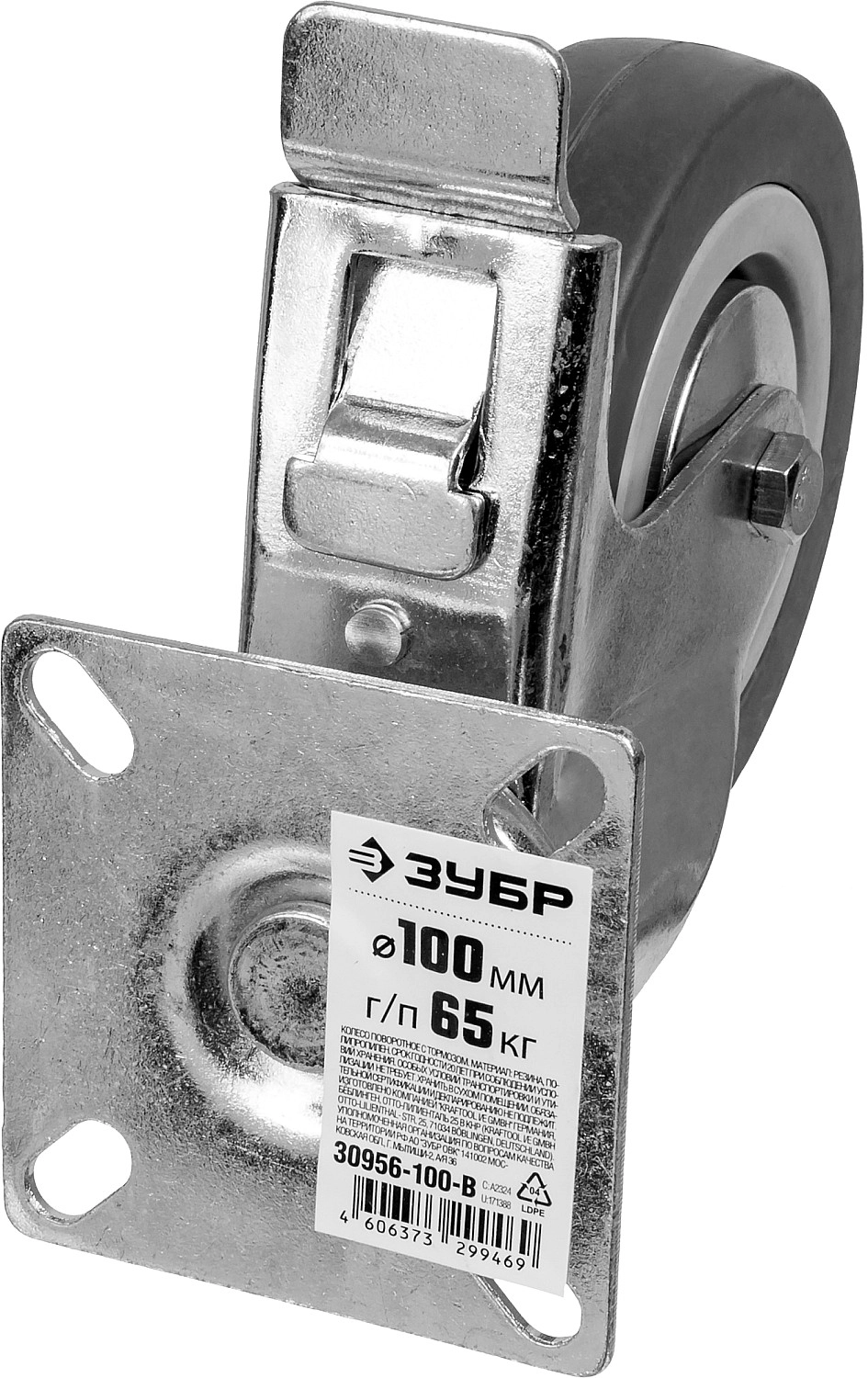 ПроизводителиКолесо поворотное с тормозом d=100 мм, г/п 65 кг, резина/полипропилен, (30956-100-B) ЗУБР
